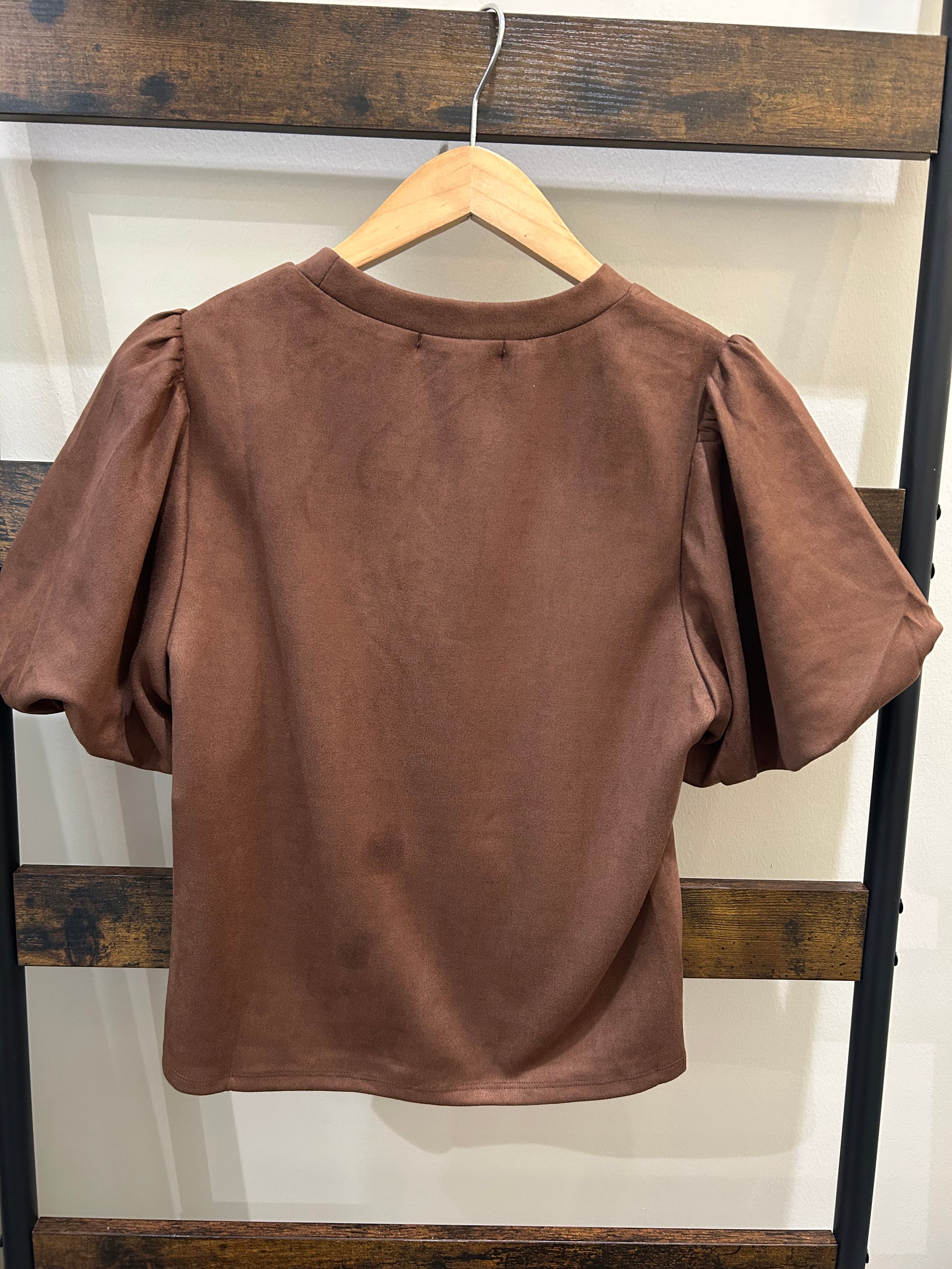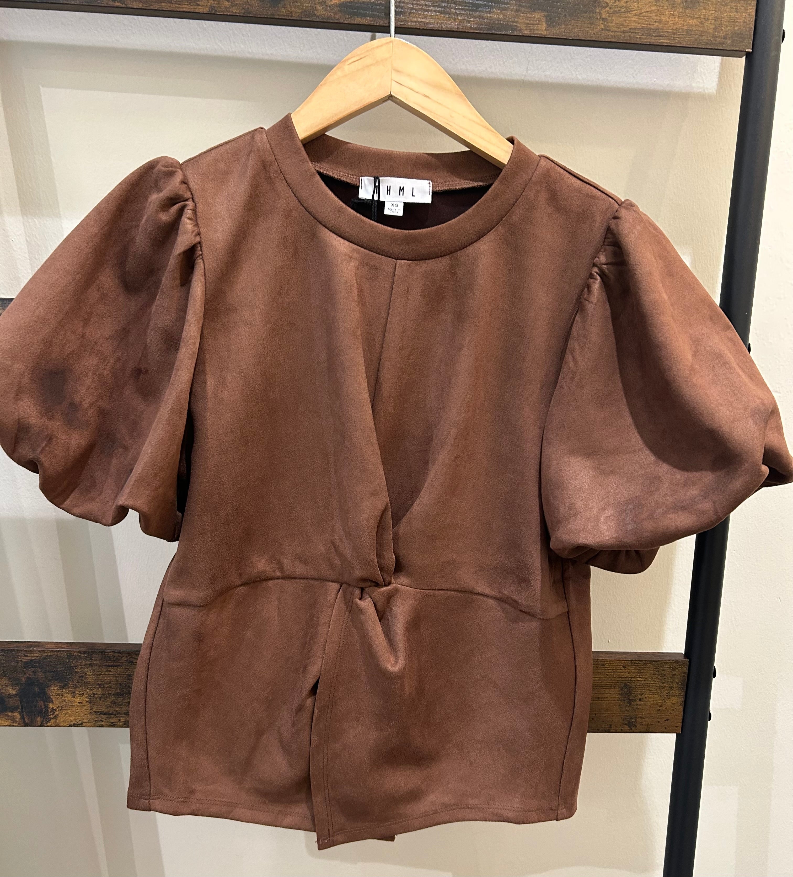 THML Puff Sleeve Twisted Detail Suede Top - Brown
