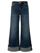 • These high-rise wide leg jeans feature a bold wide roll-up hem and come in a rich dark wash for a sleek, modern look. Designed with a touch of stretch, they offer both comfort and effortless style.