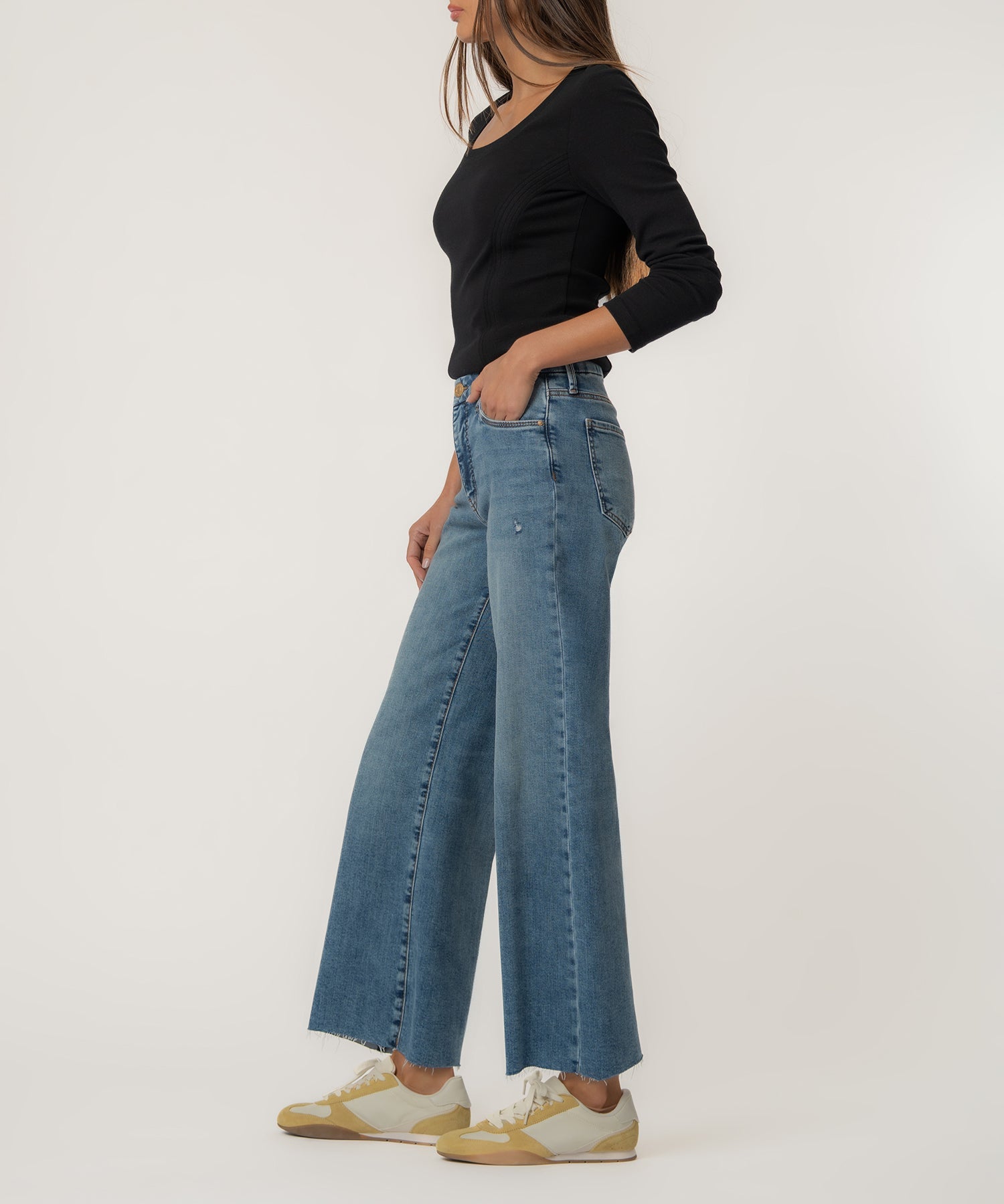 These high-rise wide leg jeans in a classic medium wash feature Fab Ab pockets for a smooth, flattering fit and stretchy fabric for all-day comfort. A raw hem and a hint of distressing give them a lived-in feel with a modern edge. Effortless and versatile, they’re your new go-to for casual cool.