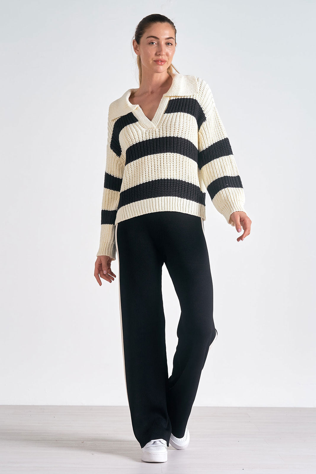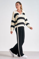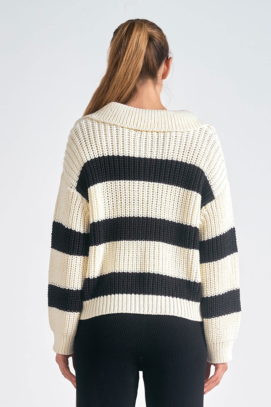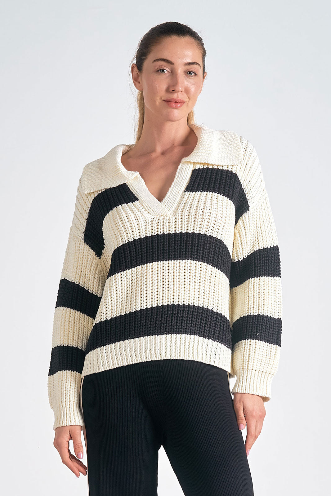 Stay cozy and stylish with the Elan V-Neck Striped Knit Sweater. Made from heavy-weight material and featuring bold stripes, this v-neck sweater is perfect for chilly days. Keep warm while making a statement!