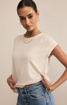 This slightly stretchy, soft top is made from our relaxed Whisper Knit Jersey, finished with subtle shirring at the shoulders for a feminine twist. With its easy body fit and crew neckline, it’s the kind of tee that always feels just right.