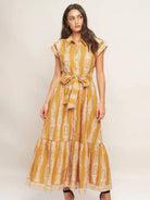 A printed woven dress featuring collar, button down, short sleeve, self sash tie and ruffled hemline Details: Self : 100% Cotton Size & Fit - Model is 5`8" And Wearing Size Small - Measurements Taken From Size Small - Approx. Length: 55"