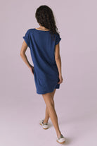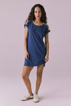 This Honest Indigo staple piece features a comfortable t-shirt dress design with contrast striped detailing, making it both easy to wear and eye-catching.