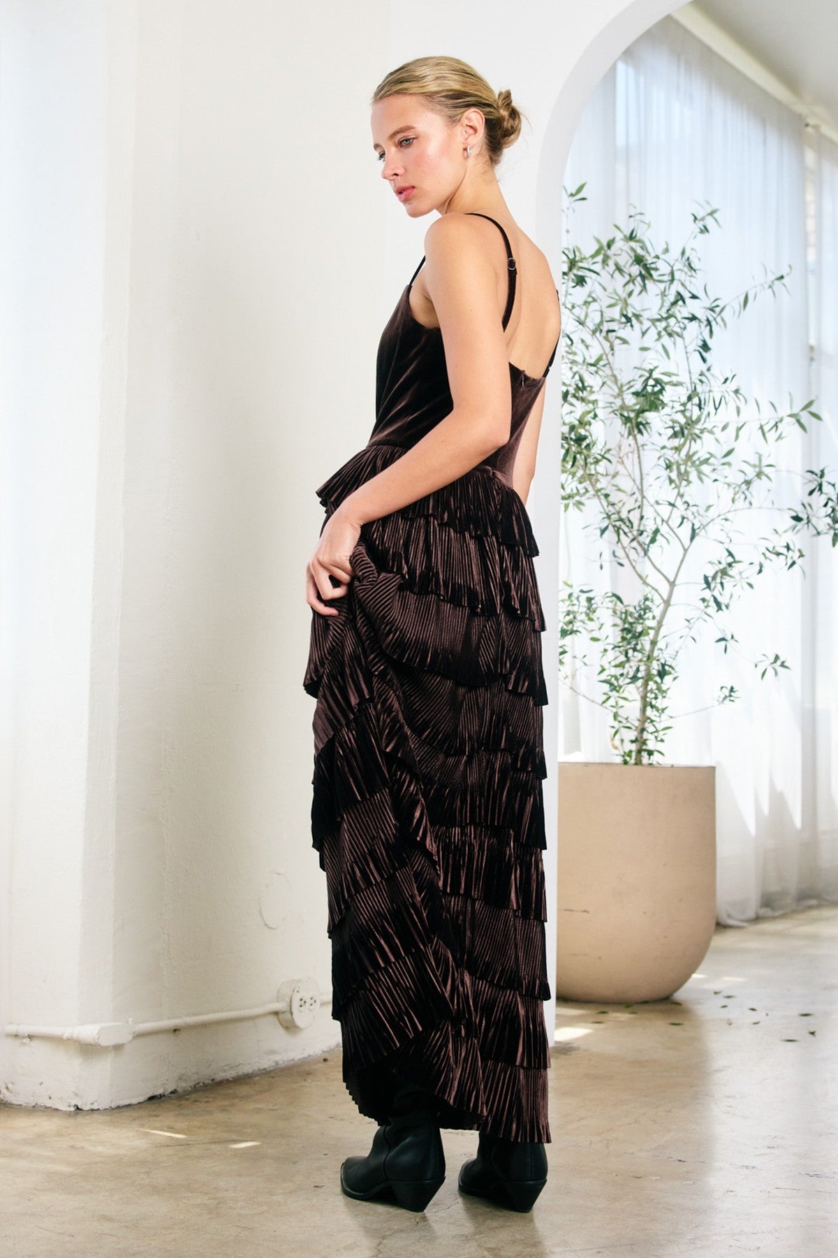 Velvet Pleated Tier Dress - Brown