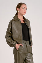 Elevate your wardrobe with the Elan Bomber Jacket in Pine, crafted from smooth faux leather for a refined look. Featuring a classic collared design and a zip-up front, this jacket combines timeless style with modern details. Practical pockets add convenience, while the cinched back and cuffs create a flattering, tailored silhouette. Perfect for layering, it brings effortless sophistication to any ensemble.