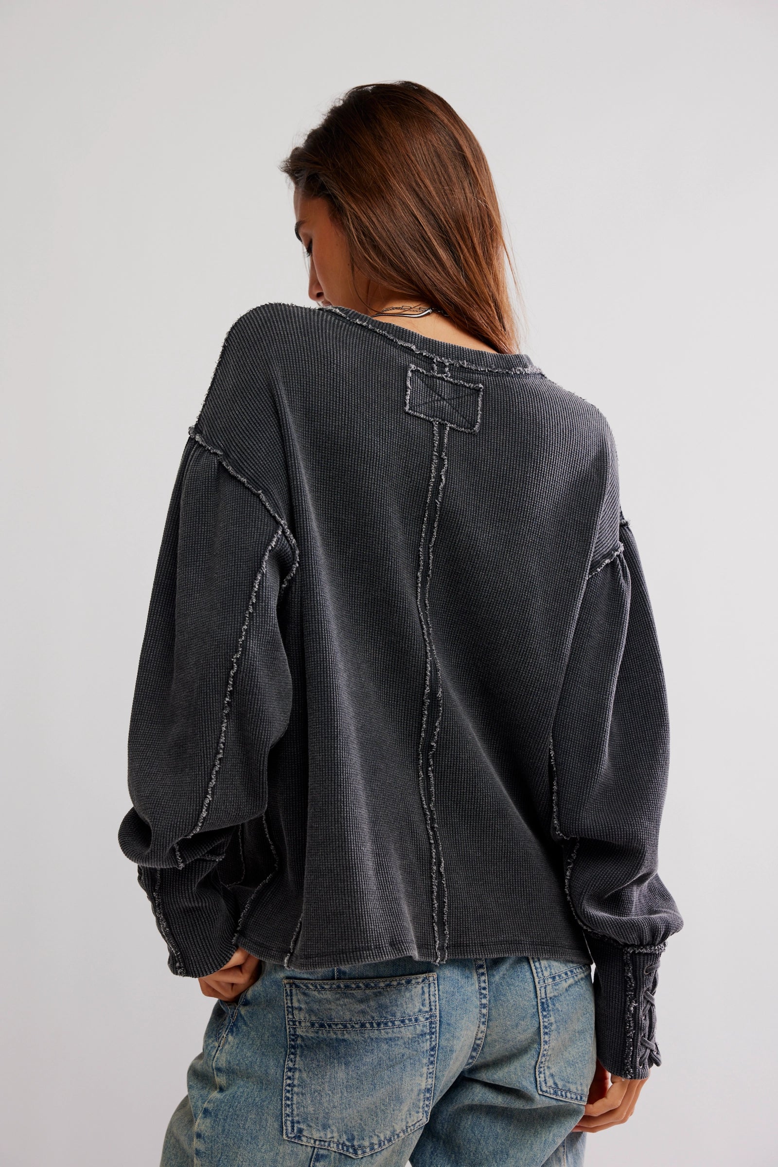 Lace-up details adorn the cuffs of this laidback long sleeve from We The Free, featured in a classic thermal fabrication with voluminous sleeves for added dimension.