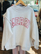 Spread holiday cheer in this cozy mock neck sweatshirt featuring festive "Merry" embroidery. The heathered grey base pairs perfectly with bold red accents, creating a cheerful look that works for casual outings or seasonal gatherings. Soft, comfortable fabric makes it ideal for layering through cooler months. A playful wardrobe essential that brings warmth and personality to your everyday style. 52% Cotton, 48% Polyester