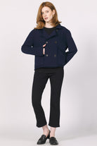 Cropped knit Velma peacoat tailored to perfection french terry. Timeless design is the ideal layering piece for transitioning seasons. The cozy knit fabric for warmth while maintaining a lightweight feel, offering versatile style that effortlessly complements any lifestyle!