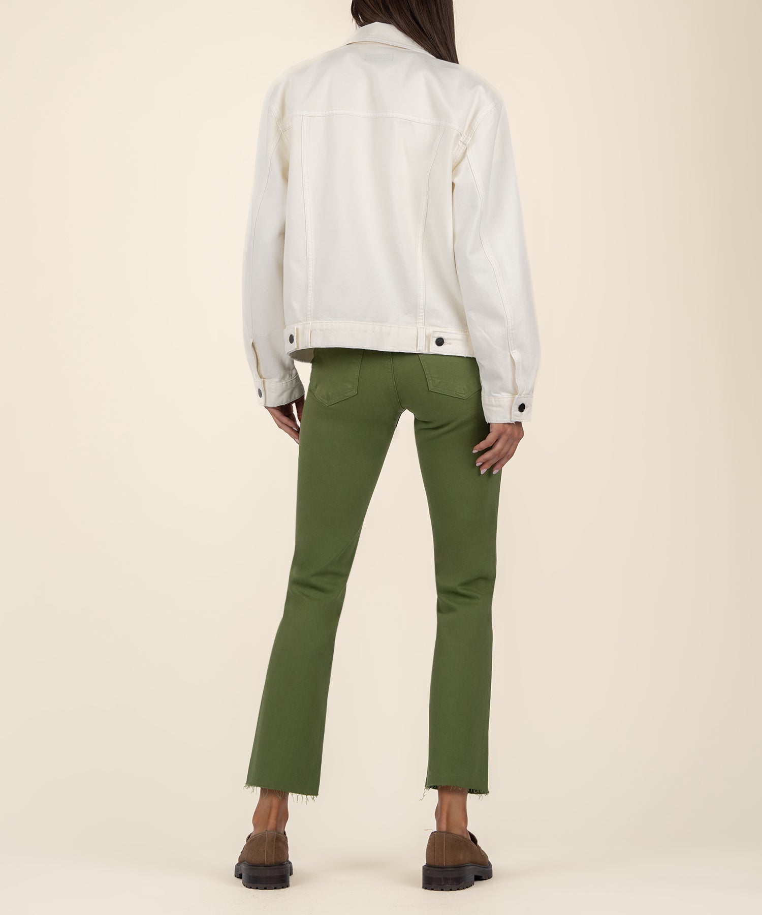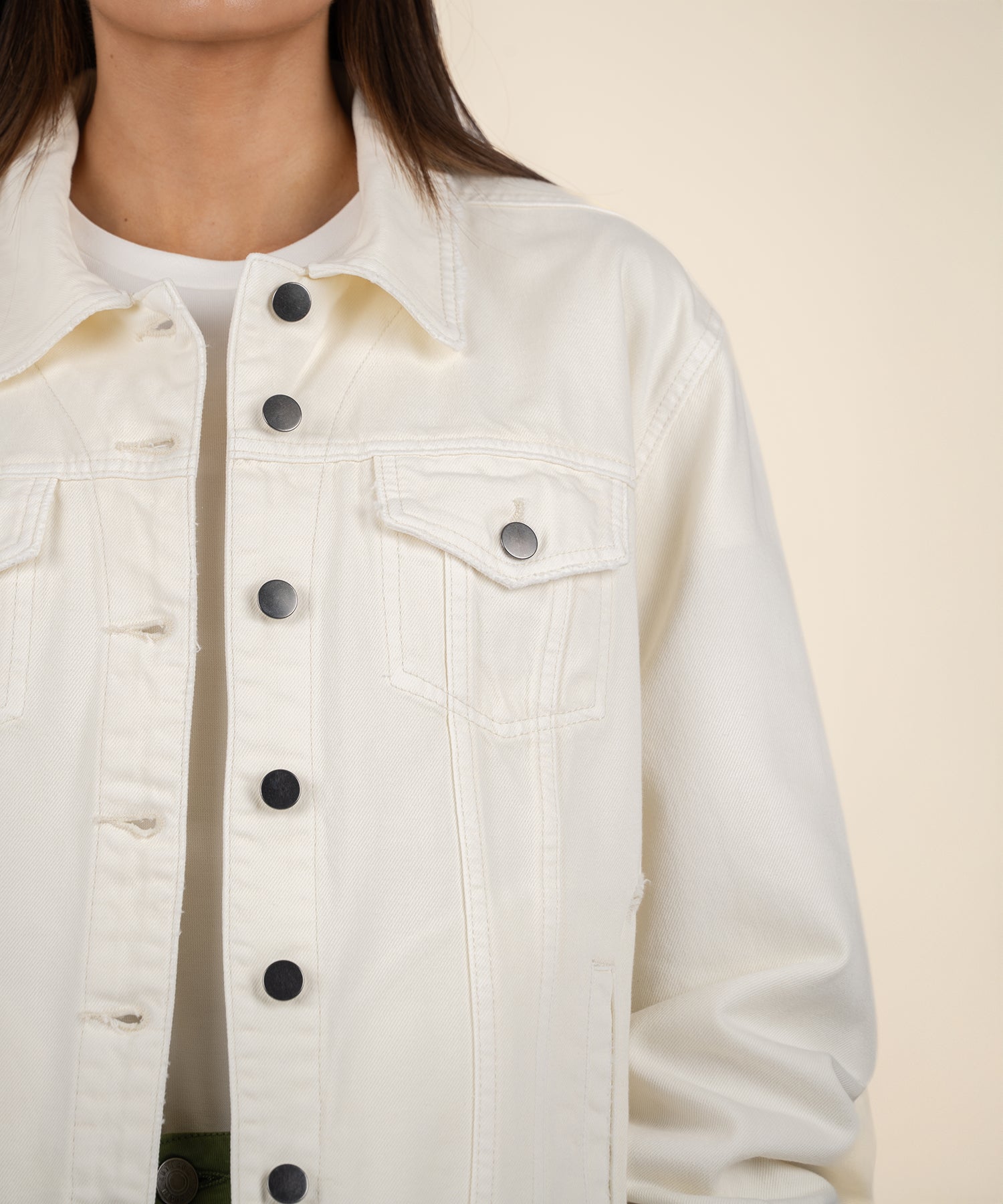This boyfriend jacket in a soft ecru color features a relaxed drop shoulder design, offering an effortlessly cool and oversized fit for a laid-back, stylish look.
