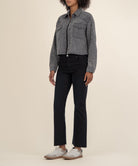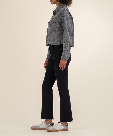 • Wild meets wearable. This animal print jacket in a cool grey shade brings attitude to your outerwear with flap patch pockets, a crisp button-front closure, and just the right amount of stretch for all-day ease. Equal parts fierce and functional — your layering game just leveled up. (Cheetah Print.)