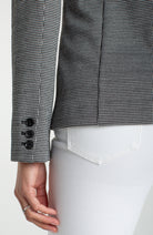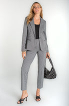 This fitted blazer features a sophisticated black and white mini checkered pattern, making it suitable for any occasion. With its sleek design and versatile style, this blazer is a must-have for any wardrobe.