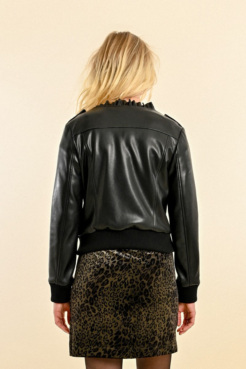 This faux leather jacket features a round neckline adorned with a ruffled band, as well as a buttoned shoulder placket with epaulet. It also offers an invisible zip fastening on the center front and a ruffled band finish. The slightly oversized long sleeves and ribbed cuff and bottom garment finishes add a stylish touch to this piece.