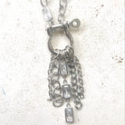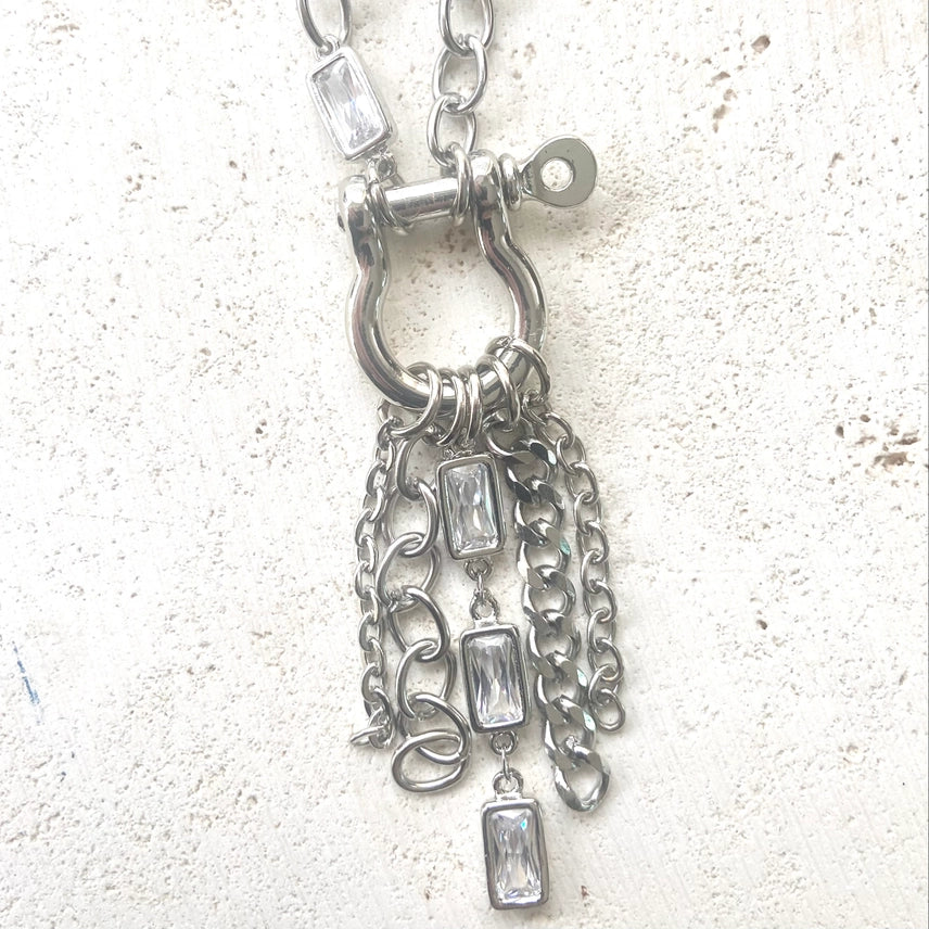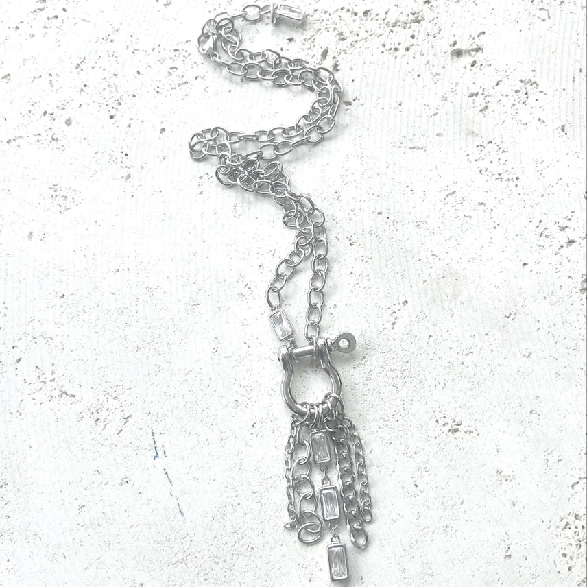 The stainless steel edgy glam, shackle necklace features a handmaid tassel that can be removed. You can wear them with or without them. Adjustable up to 20”