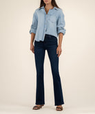 Easily transition from day to night in subtly flared bootcut jeans cut slim from soft, stretchy, deep blue denim in a mid rise fit.