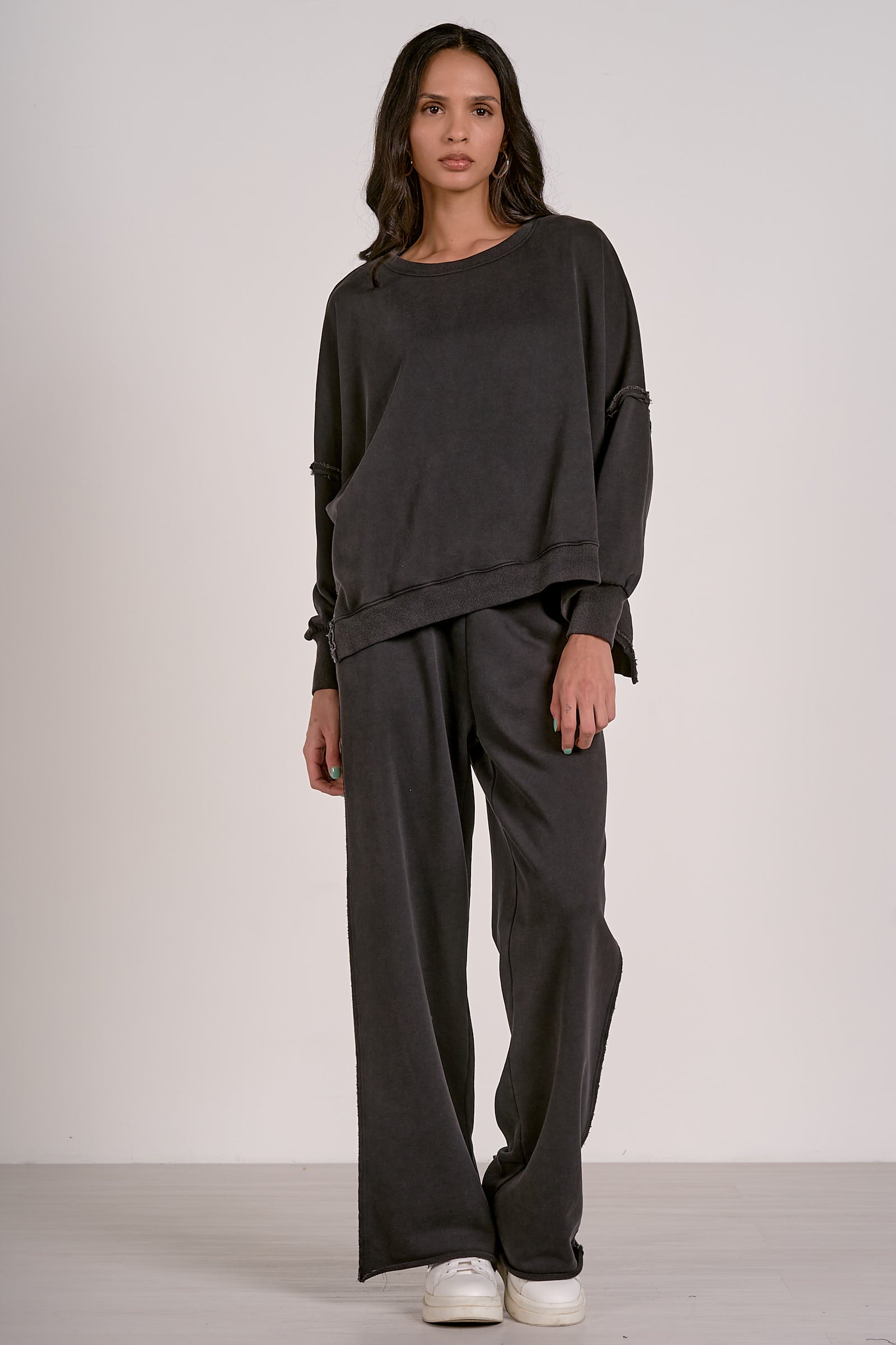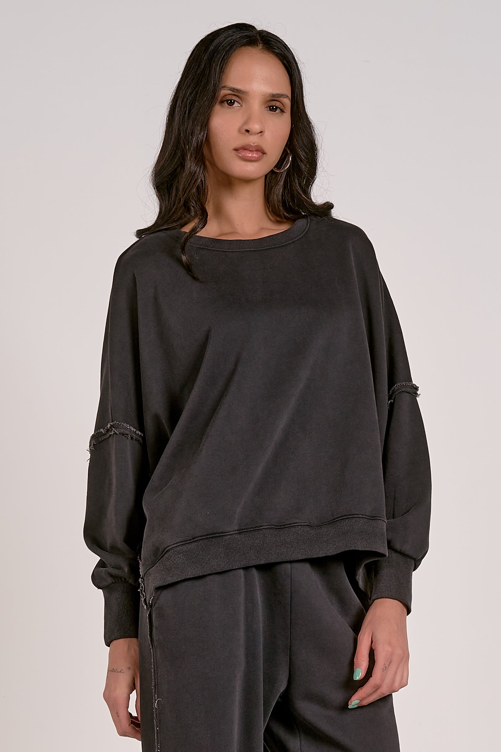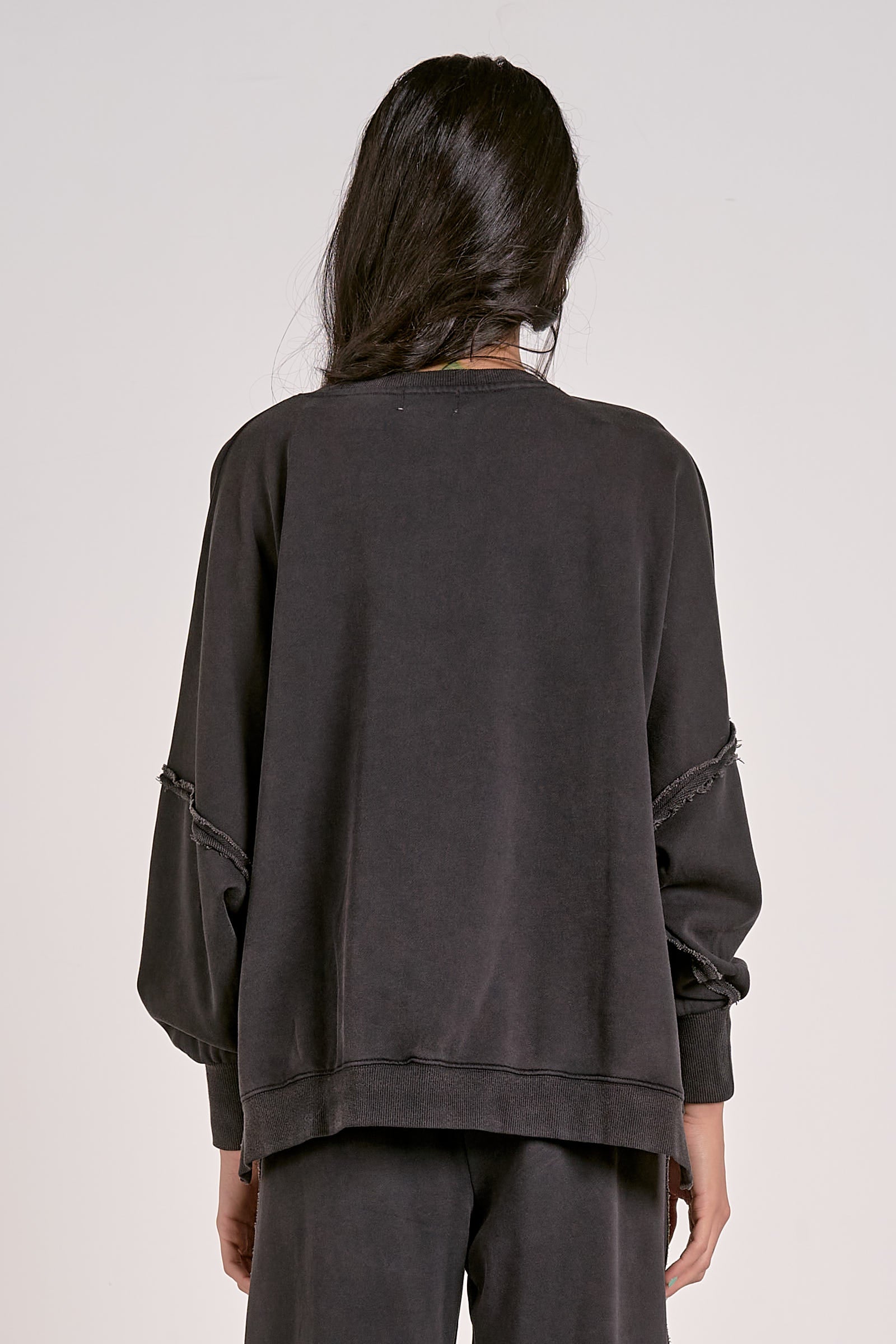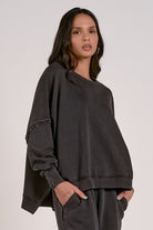 Elevate your style with the Elan Oversized Crewneck in Black. This sweatshirt features distressed detailing, adding a rugged and edgy touch to your look. Stay comfortable while making a statement.