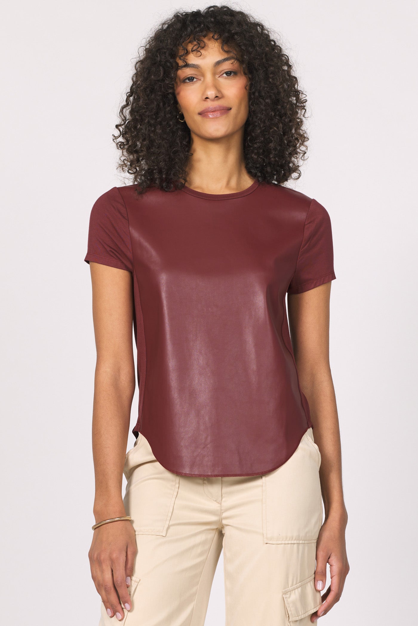 Elaina short sleeve front vegan leather top stands out in every crowd. Designed for appreciation of quality and comfort, this sophisticated crew neck piece adds a hint of edge to any outfit. Perfect for any lifestyle, pairs effortlessly with any bottoms for your favorite look.