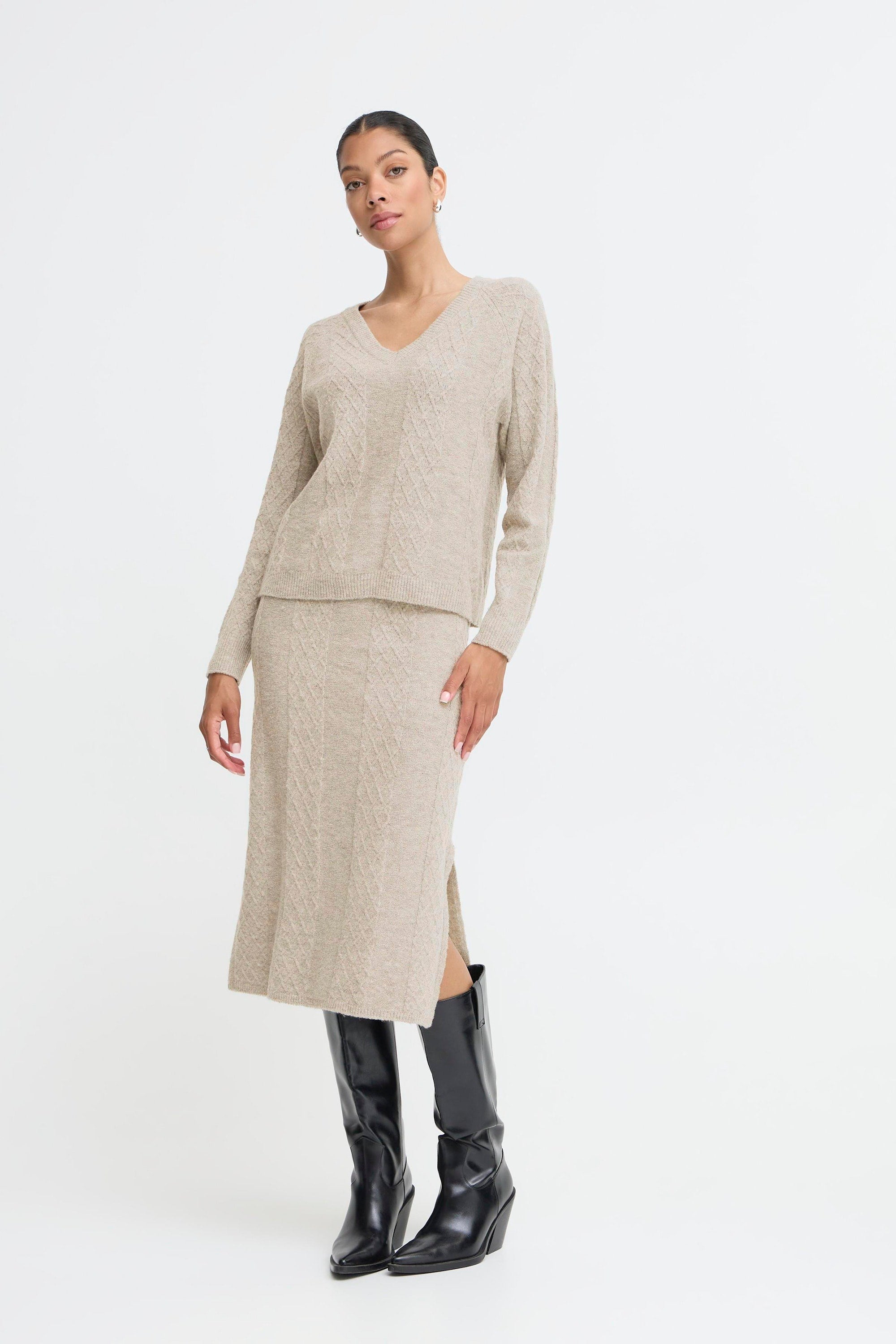 Sweater with V-neckline and relaxed silhouette offers comfortable wear and modern style. Long sleeves and ribbed trim provide timeless versatility for any occasion.