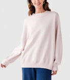 Features: French terry fabrication, mock neckline, drop-shoulder long sleeves, ribbed trim, exposed seams