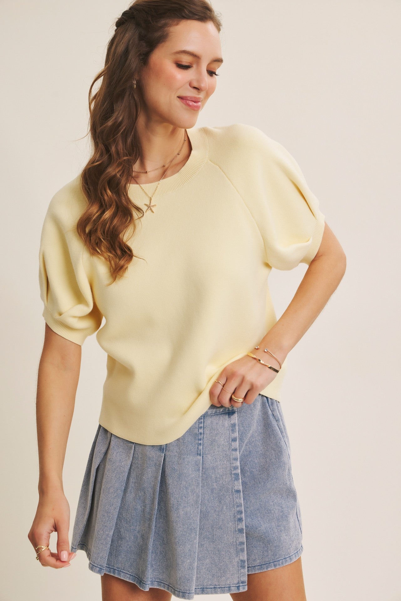 for an elevated everyday look. 100% Cotton. Features - Crewneck - Stretchy cotton sweater knit - Raglan armhole - Voluminous short sleeves - Ribbed neck and cuffs