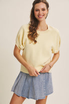 Soft cotton sweater knit top with crew neckline and raglan armholes. Features voluminous short puff sleeves, ribbed neck and cuffs, and a