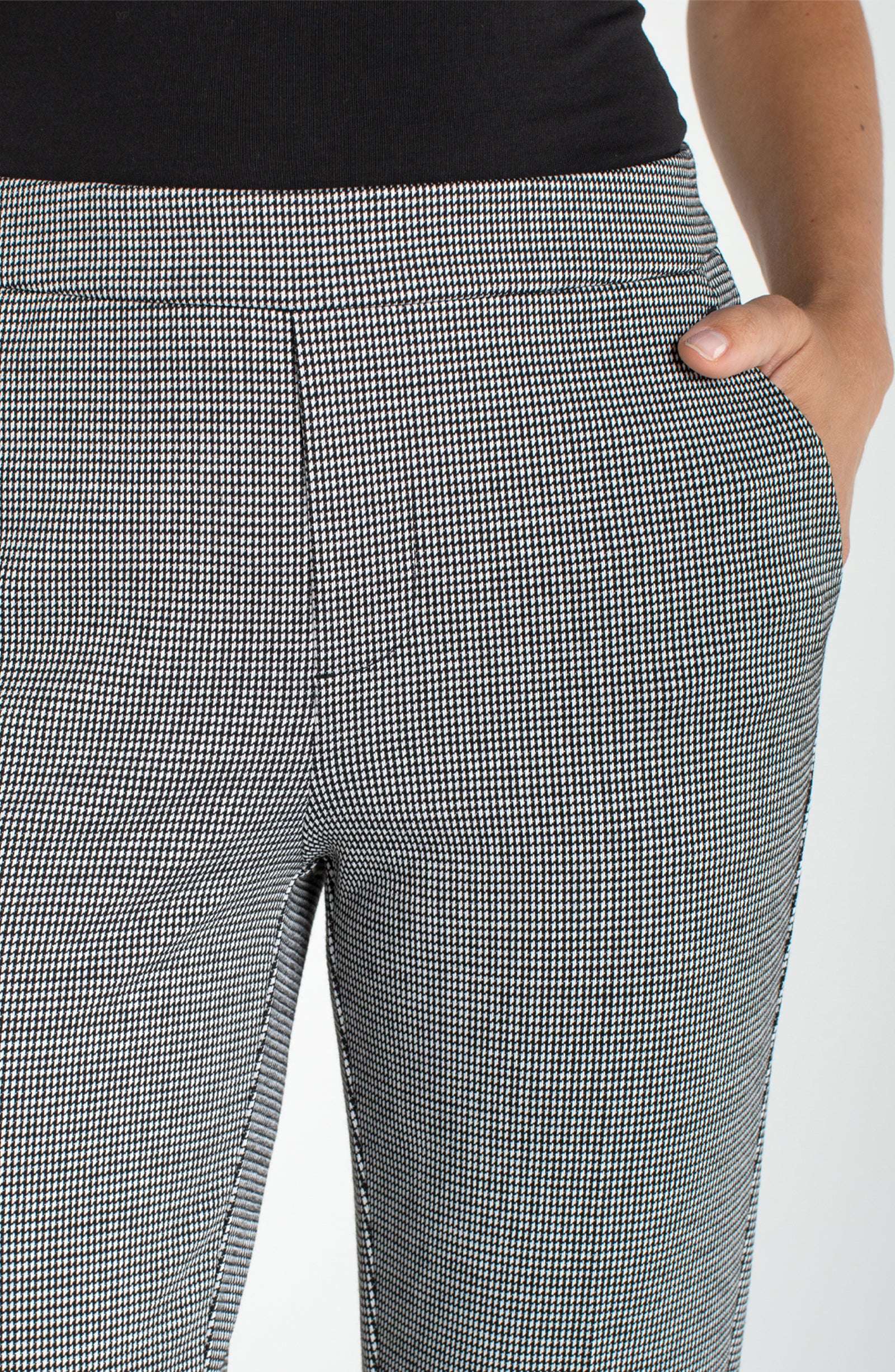 Effortless style meets timeless pattern in the Liverpool Kayla Pull-On Trouser. The black and white mini check design brings visual interest to your everyday rotation, while the pull-on silhouette means zero fuss—just slip on and go. Perfect for mixing with solid tops or layering over your favorite tee. Comfort and chic collide in this wardrobe essential that works from desk to dinner.
