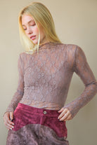 High Neck Fitted Sheer Mesh Lace Knit Top - Long Sleeve (Model height: 5'8", wearing a Small