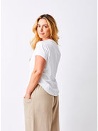Elevate your everyday basics with the Suzy D Wanda Hi Lo Curved Hem Tee in crisp white. This playful staple features a flattering curved hem that dips lower in front and back, creating an effortlessly chic silhouette that works solo or layered. Crafted for comfort and versatility, it pairs seamlessly with your favorite denim, skirts, or joggers. A wardrobe essential that brings subtle style to any outfit.