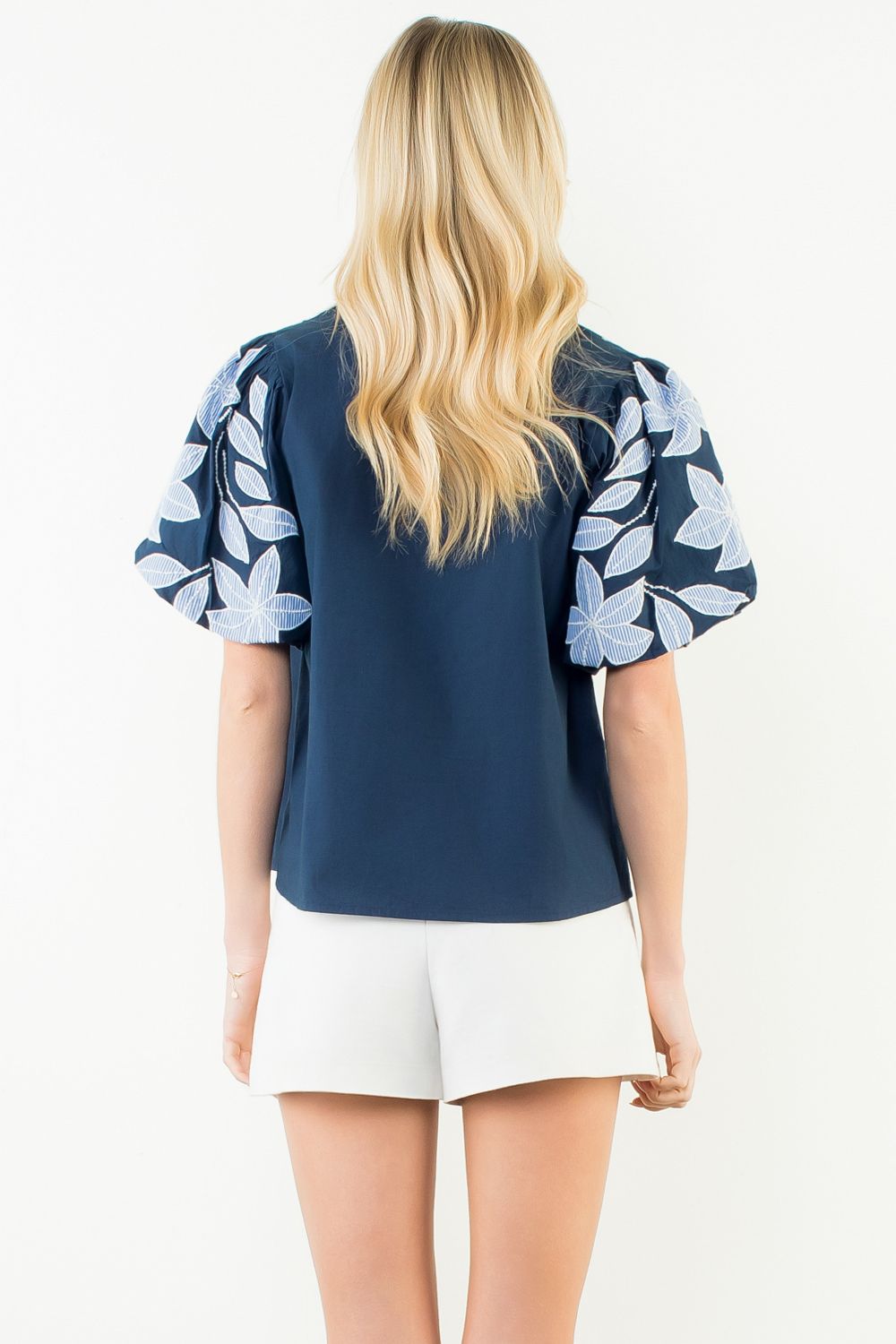 THML Floral Embroidered Puff Sleeve V-Neck Top in Navy Cotton