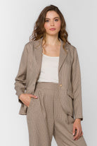 This houndstooth blazer offers a tailored look with its long sleeves, front button closure, and flap pockets. Crafted from a medium-weight fabric with a soft, fluid relaxed drape.