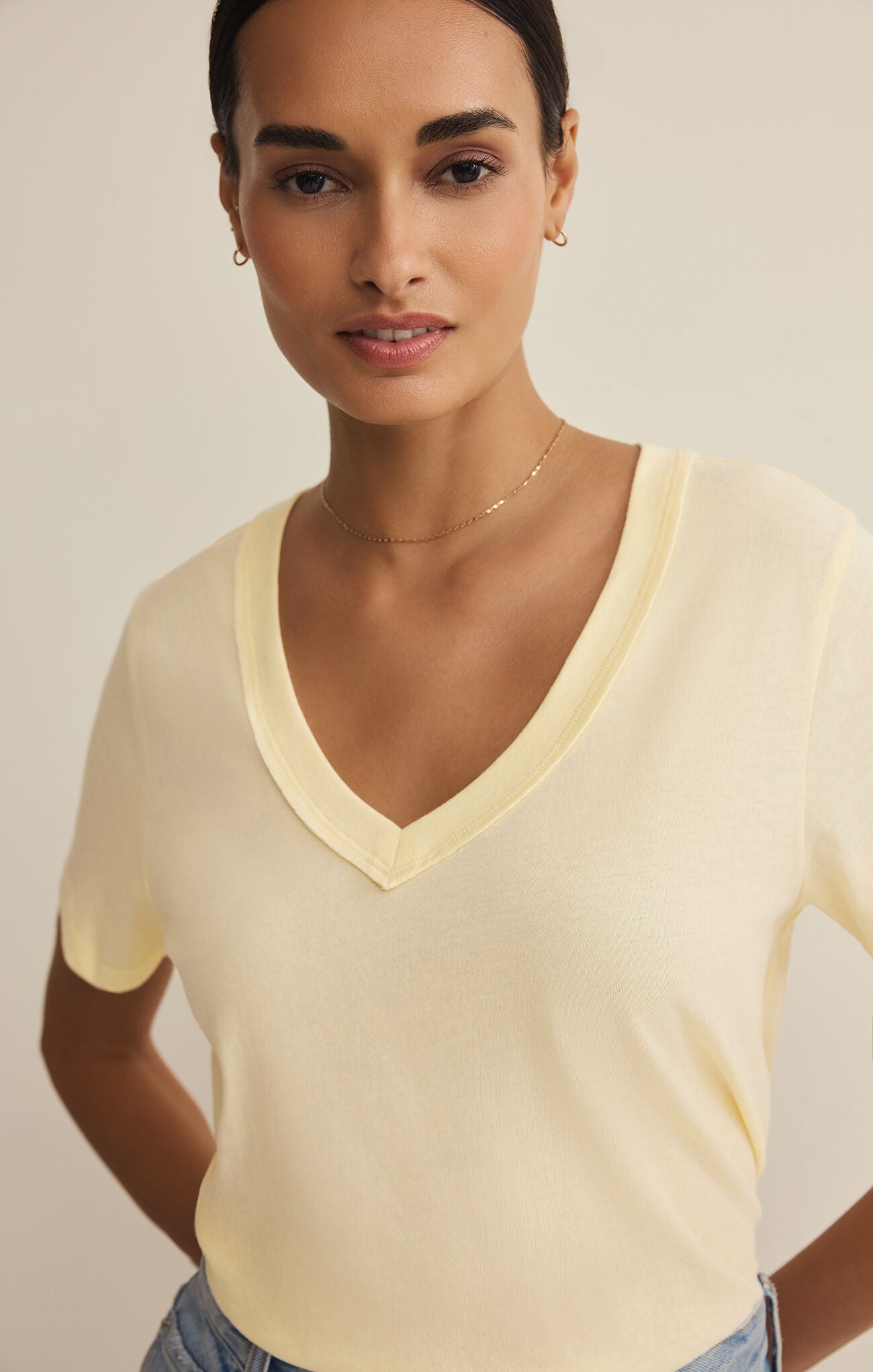 Brighten up your everyday wardrobe with the Z SUPPLY Elara Top in a refreshing Pineapple hue. Expertly crafted from 100% cotton jersey, this essential short-sleeve top features a flattering V-neck with a sophisticated wide-trim detail. Its relaxed fit and lightweight feel make it the ultimate go-to for effortless styling, whether you’re lounging at home or heading out for brunch.
