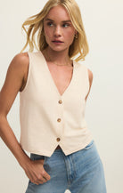 Detailed with a button front, v-neck, and lightweight textured knit fabric, this sleeveless top will be a forever staple in your wardrobe. Make it your go-to outfit with its matching pant or denim.