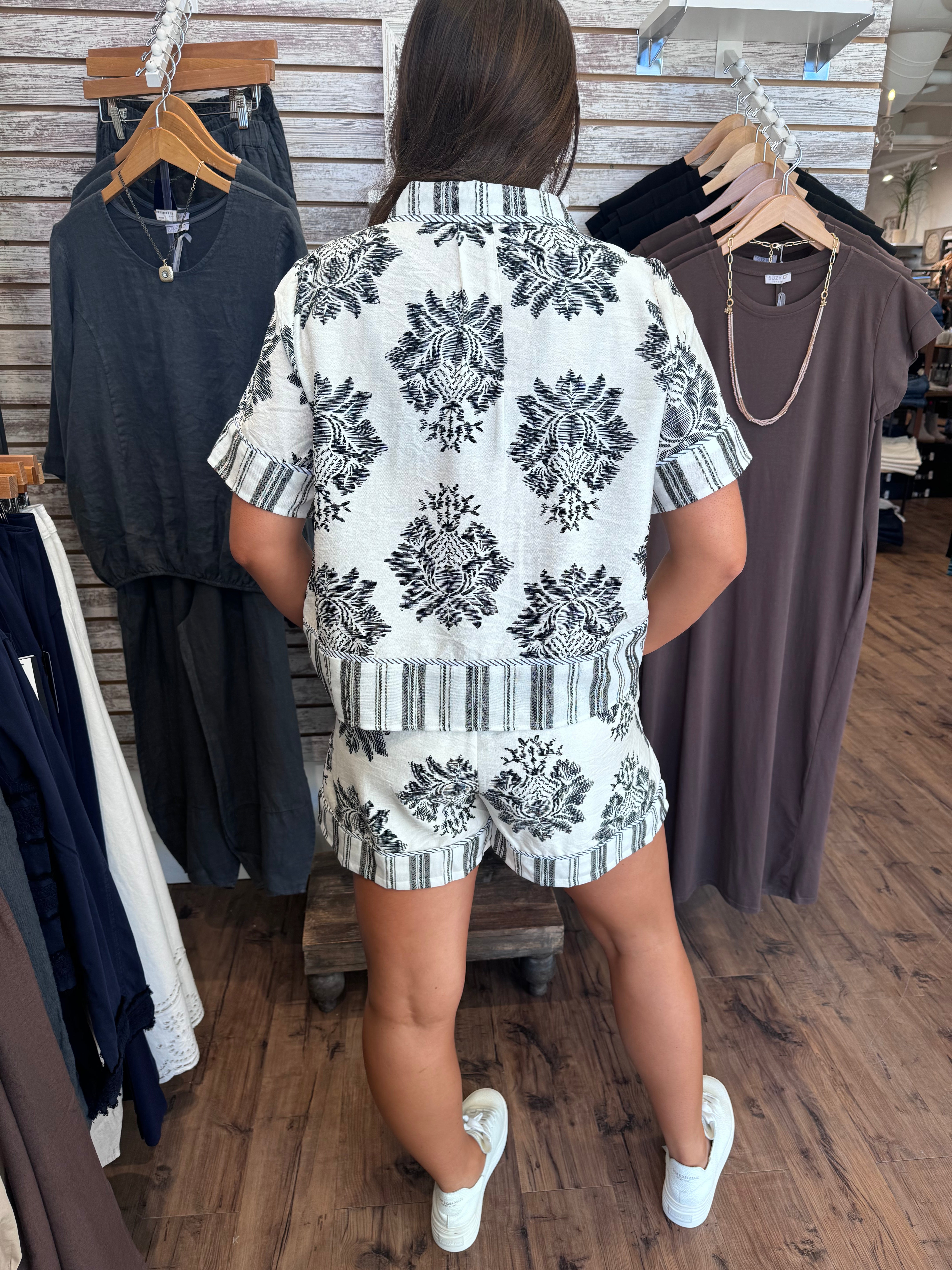 Doe & Rae Printed Shorts - White/Black These printed shorts are your new go-to for laid-back style with personality. The striking monochrome graphic pops against the crisp white and black palette, making them endlessly mixable with your favorite tops and sneakers. Whether you're running errands, meeting friends, or just vibing at home, they deliver that effortless cool factor without trying too hard. Comfortable enough to live in, bold enough to stand out—what's not to love? 85% Rayon, 15% Nylon