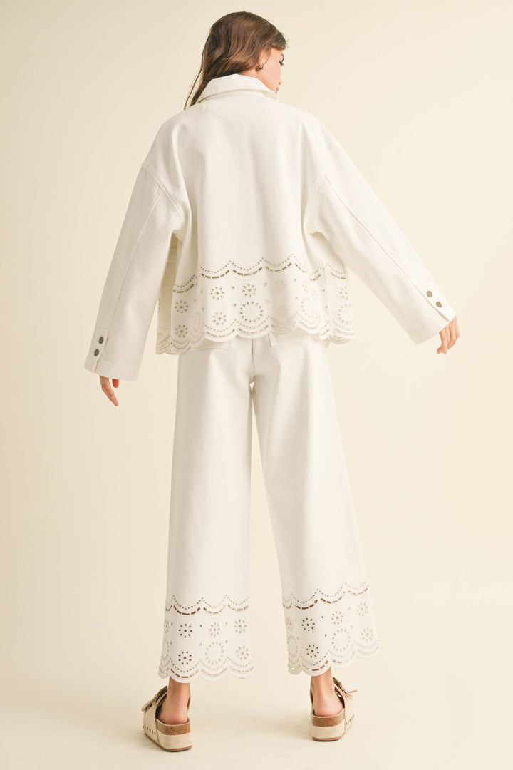 Crisp, clean, and effortlessly feminine—the Eyelet Pant is your go-to for breezy sophistication. Designed in a soft white denim with a wide-leg silhouette, these high-waisted pants bring understated charm to your everyday look. The eye-catching scalloped hem features delicate eyelet embroidery, adding a touch of romantic detail that feels both modern and timeless. Finished with side pockets and a clean front closure, this pant balances comfort with elevated design. *PLEASE NOTE THE WHITE IS A CREAM-WHITE in PERSON.