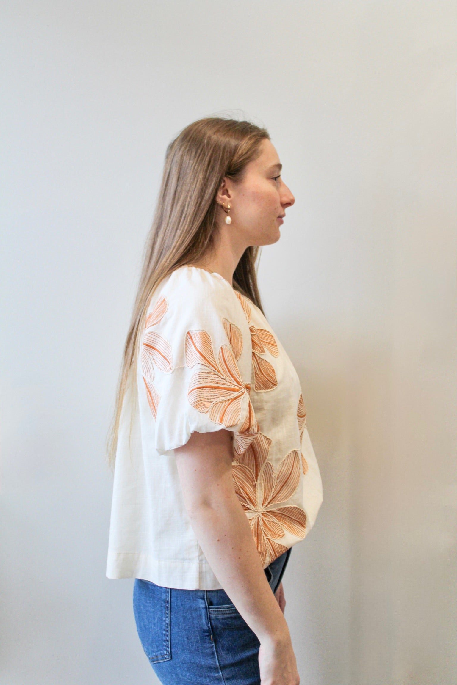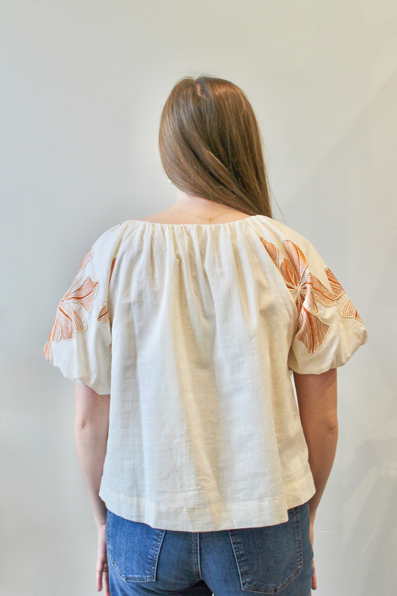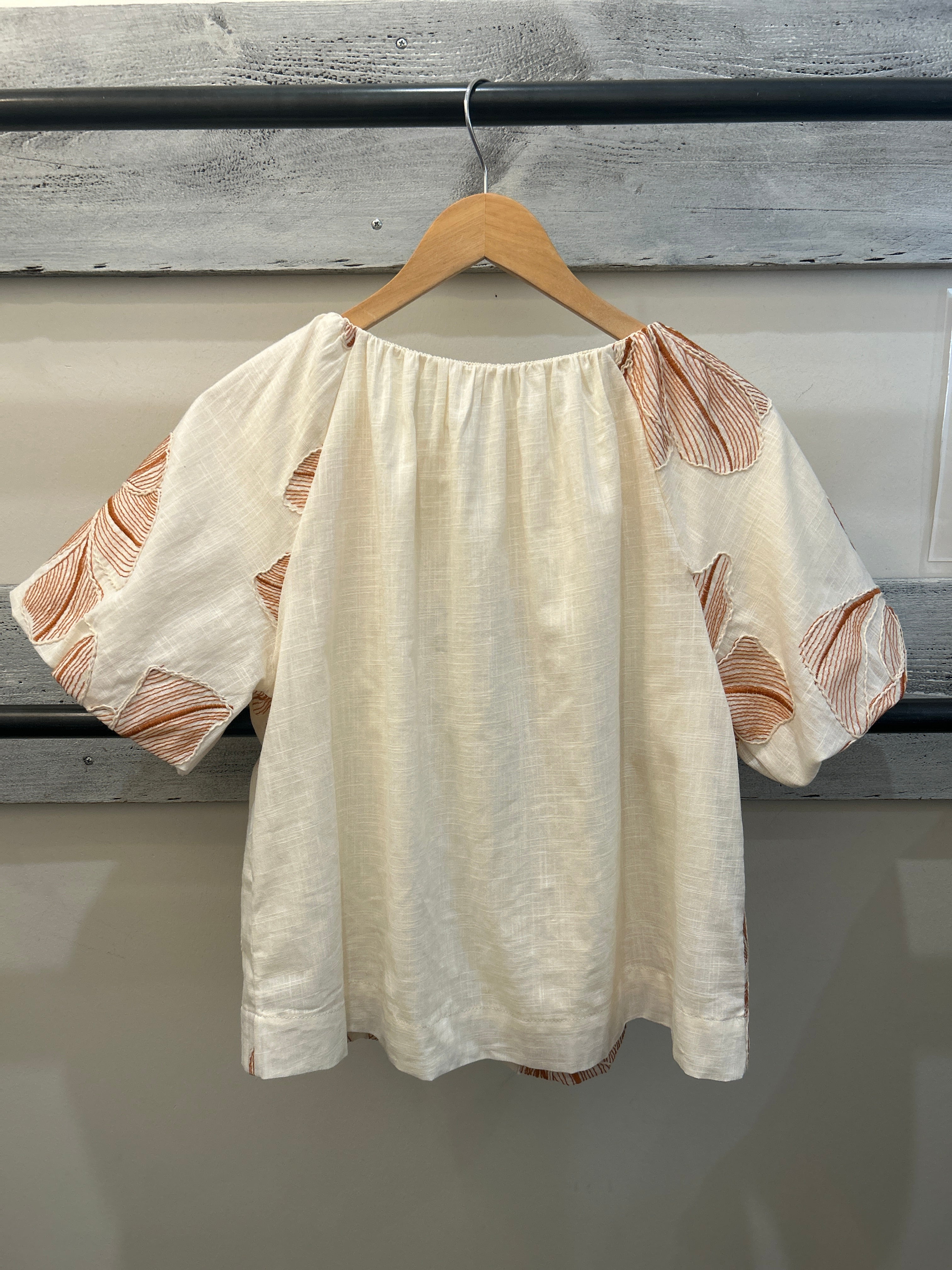 THML Puff Sleeve Floral Embroidery Detail Top - Tan/Cream