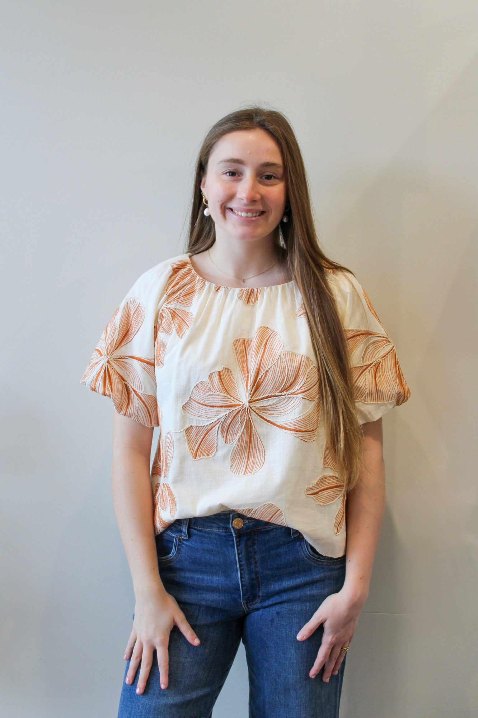 THML Puff Sleeve Floral Embroidery Detail Top - Tan/Cream