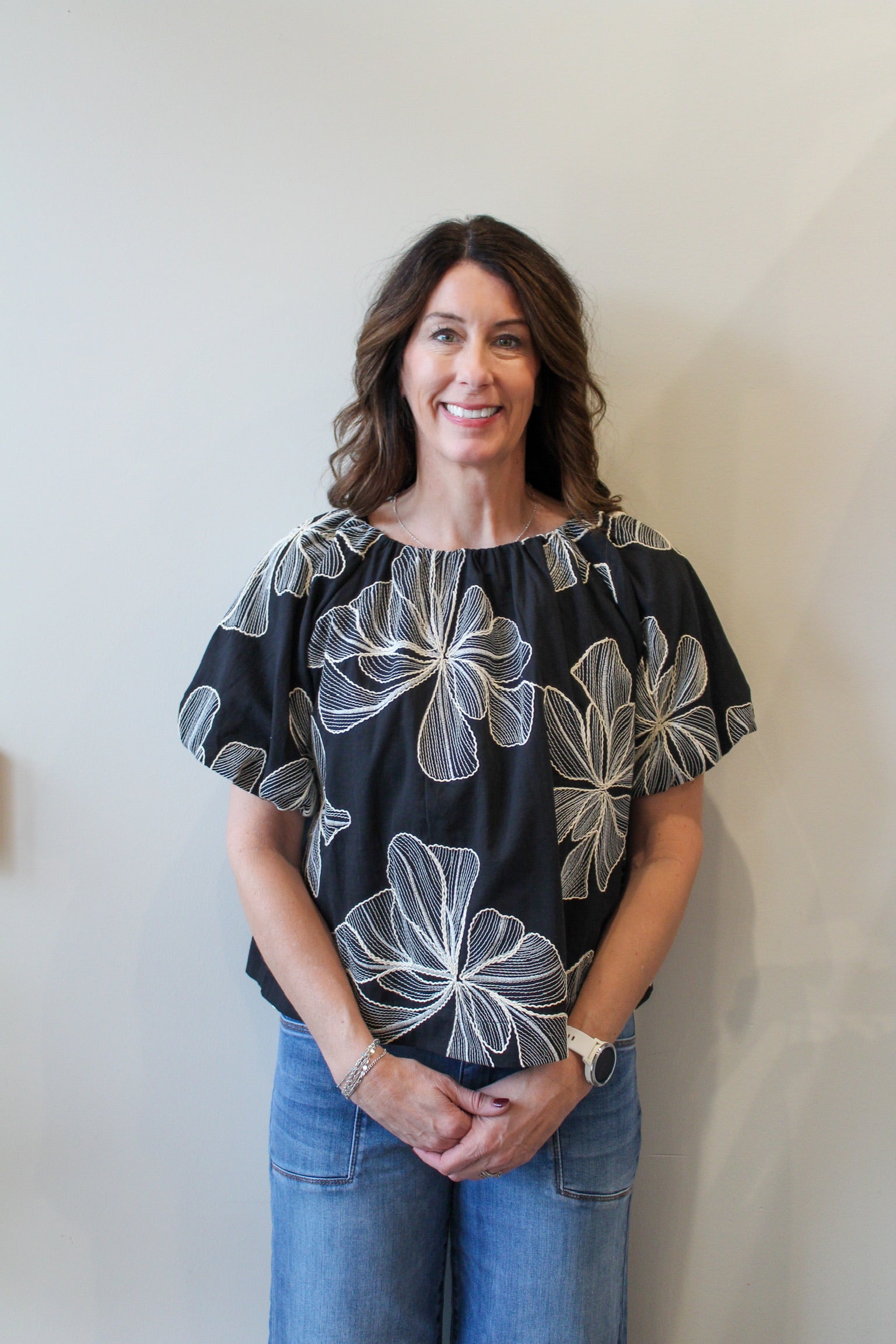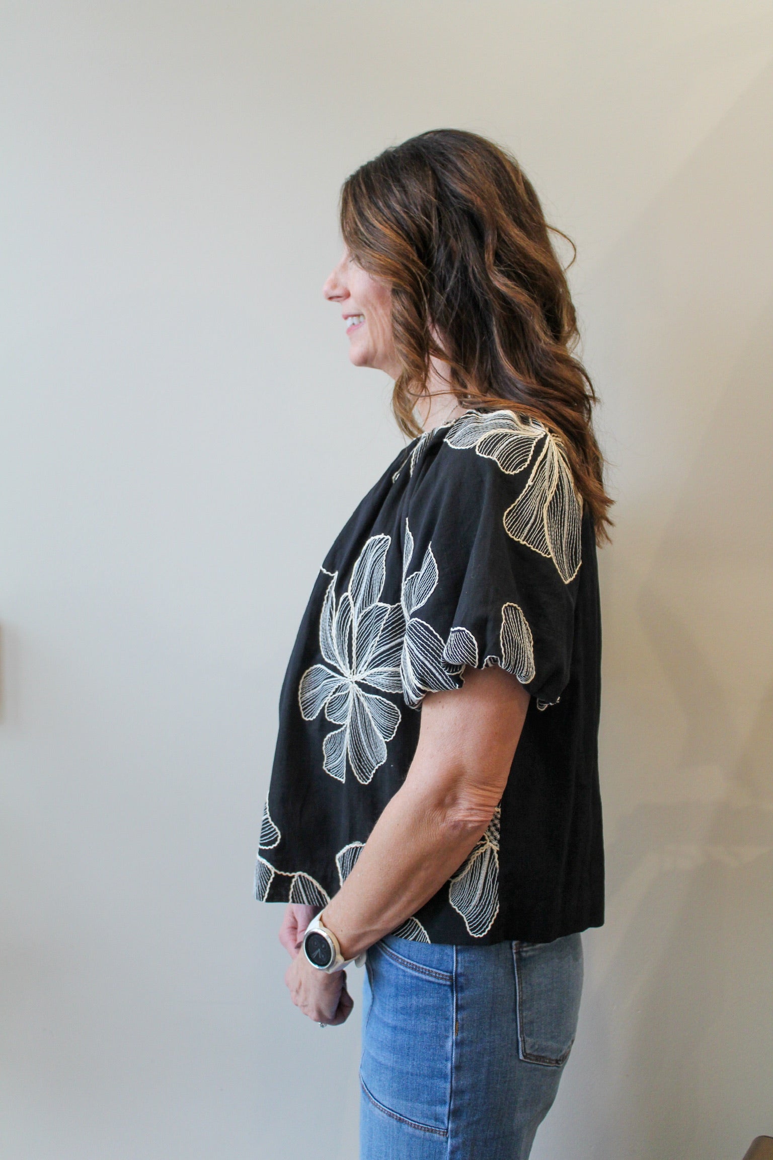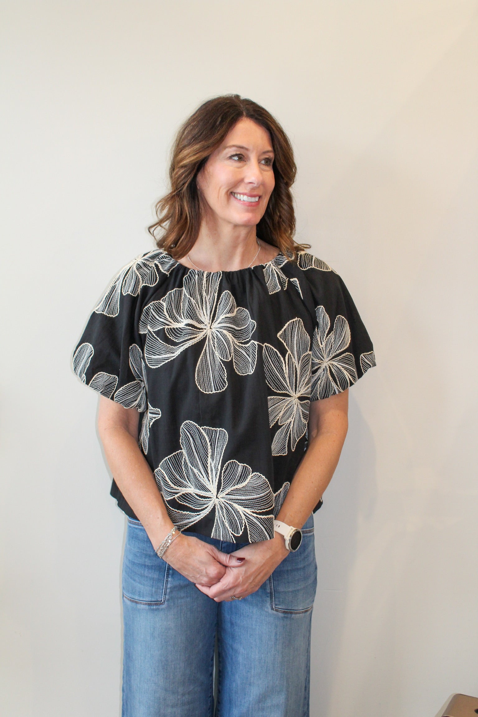 THML Puff Sleeve Floral Embroidery Detail Top - Black