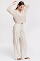 Lounging in the Vania drop shoulder v-neck sweater, a staple that seamlessly blends style and comfort. Designed with a relaxed fit and drop shoulder design, this versatile outfit is perfect for layering or wearing on its own. The neckline adds a touch of elegance, making it enjoyable for casual outings or more formal occasions. Made from soft yarn, this sweater ensures that you stay cozy and comfortable throughout the day, embodying the perfect balance of chic style and everyday ease.