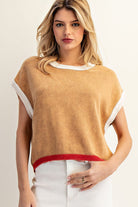 Mineral washed sleeveless sweater top featuring a ribbed round neckline,