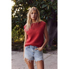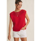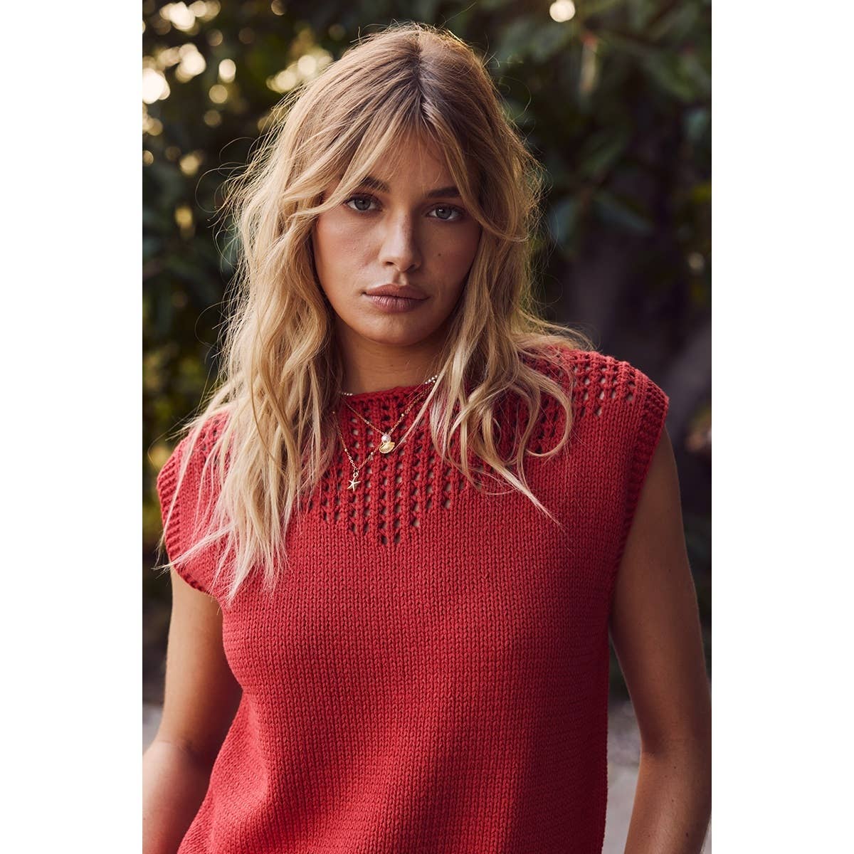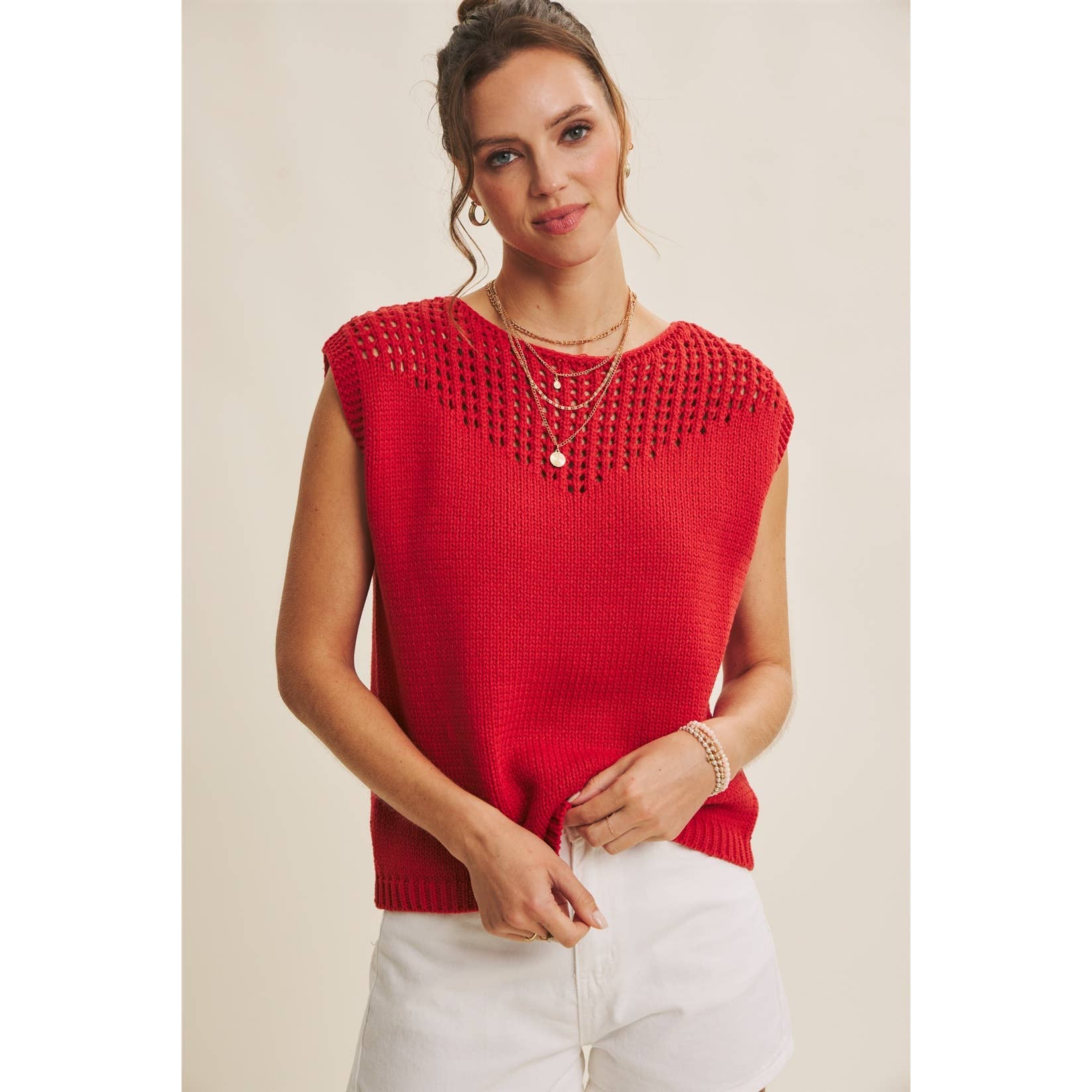 Throw on this sleeveless wonder and watch your outfit instantly level up. The open knit yoke creates an airy, textured focal point that catches the light just right, while ribbed detailing at the neckline, sleeves, and hem keeps everything grounded and intentional. In bright red, it's your new go-to for layering over basics or wearing solo when the weather cooperates. Effortless style that doesn't take itself too seriously.