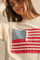 Stay Cozy, Stylish, AND Patriotic, with the Miou Muse Flag Patch Front Sweatshirt in Cream. Made from 100% cotton, this soft sweatshirt features a charming flag patch that adds a playful touch to your casual look. Perfect for layering or lounging, it combines comfort and fun in one easy-to-wear piece.