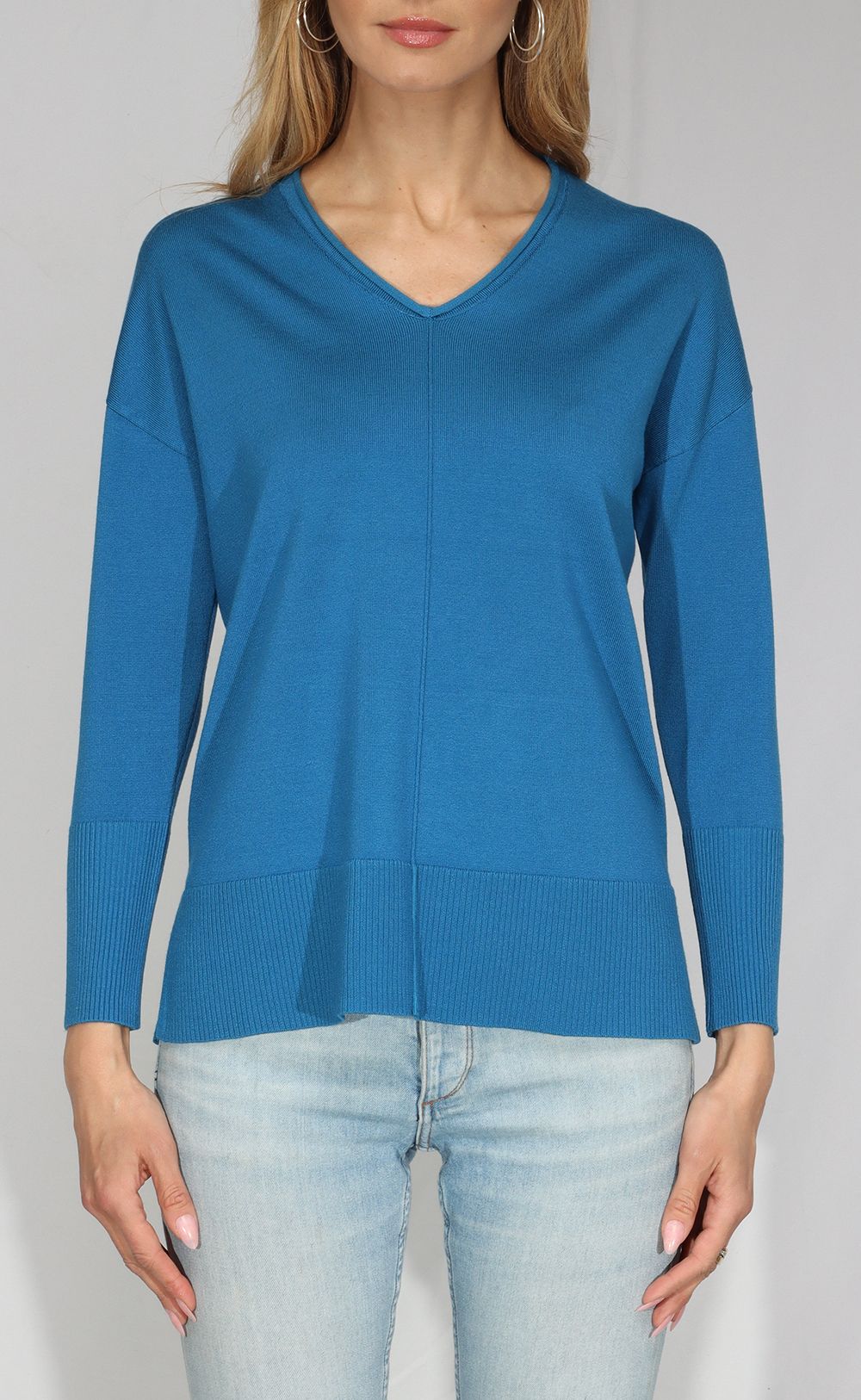 Oversized Rib Sleeve Pullover w/ Faux Seams - Indigo Blue