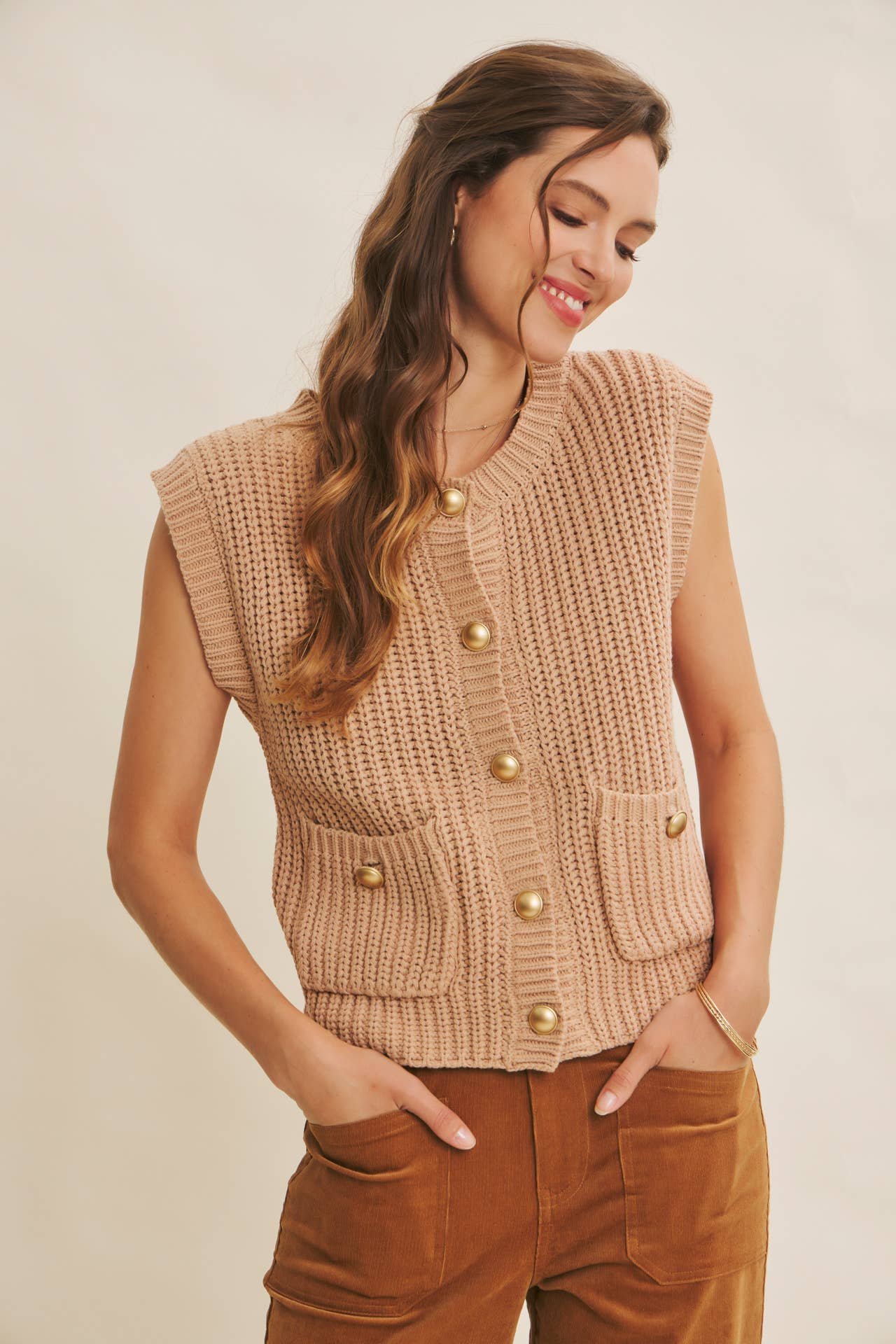 In February Timeless Charm Antique Button-Down Chunky Sweater Vest - Hazelnut