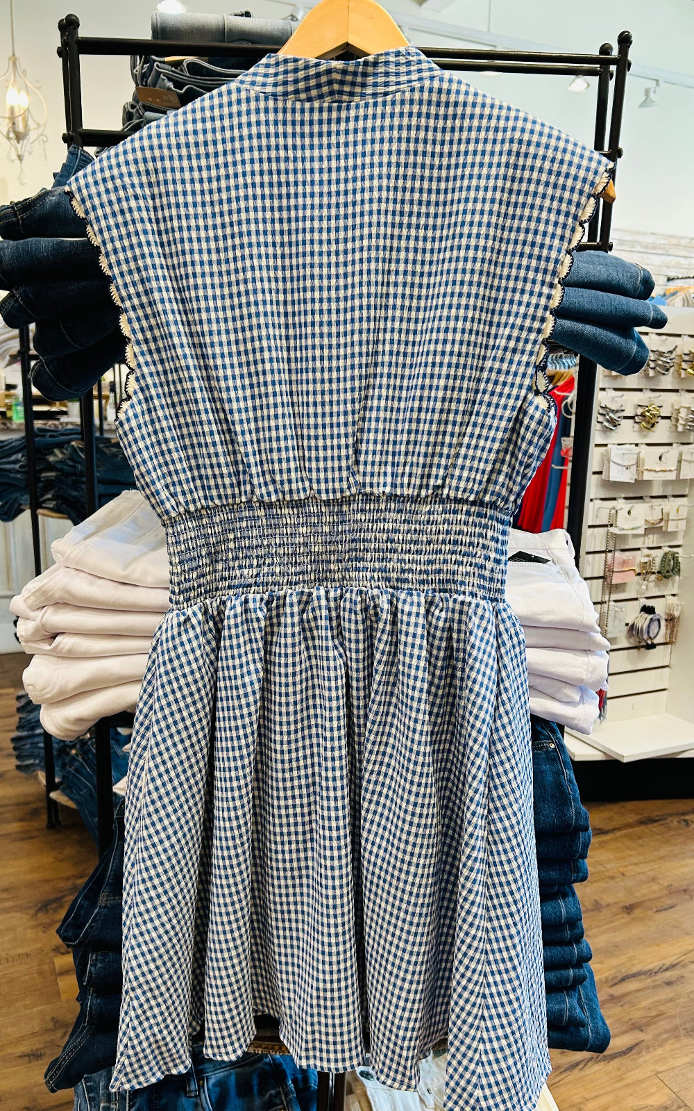 THML Blue Gingham Smocked Dress with Scalloped Sleeve Detail