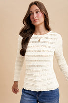 This cream stretch knit top is all about playful charm with its horizontal ruffle details, wide round neckline, and long sleeves. The fitted waist-length cut adds a fun, flattering shape you'll love.
