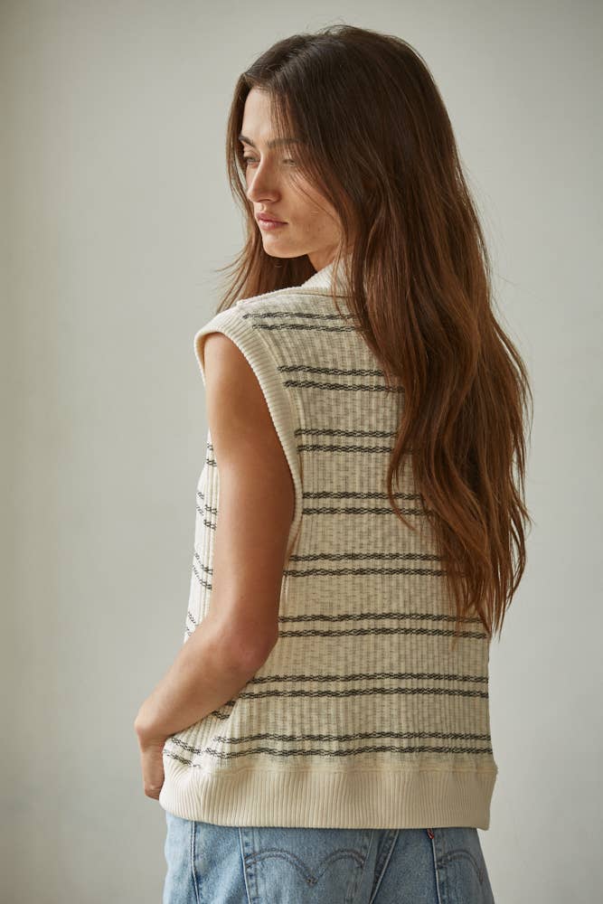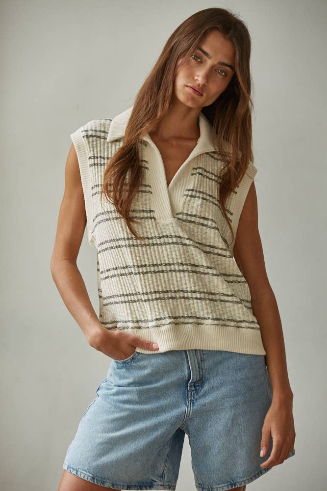 By Together Knit Open Collar Sleeveless Top - Cream Black