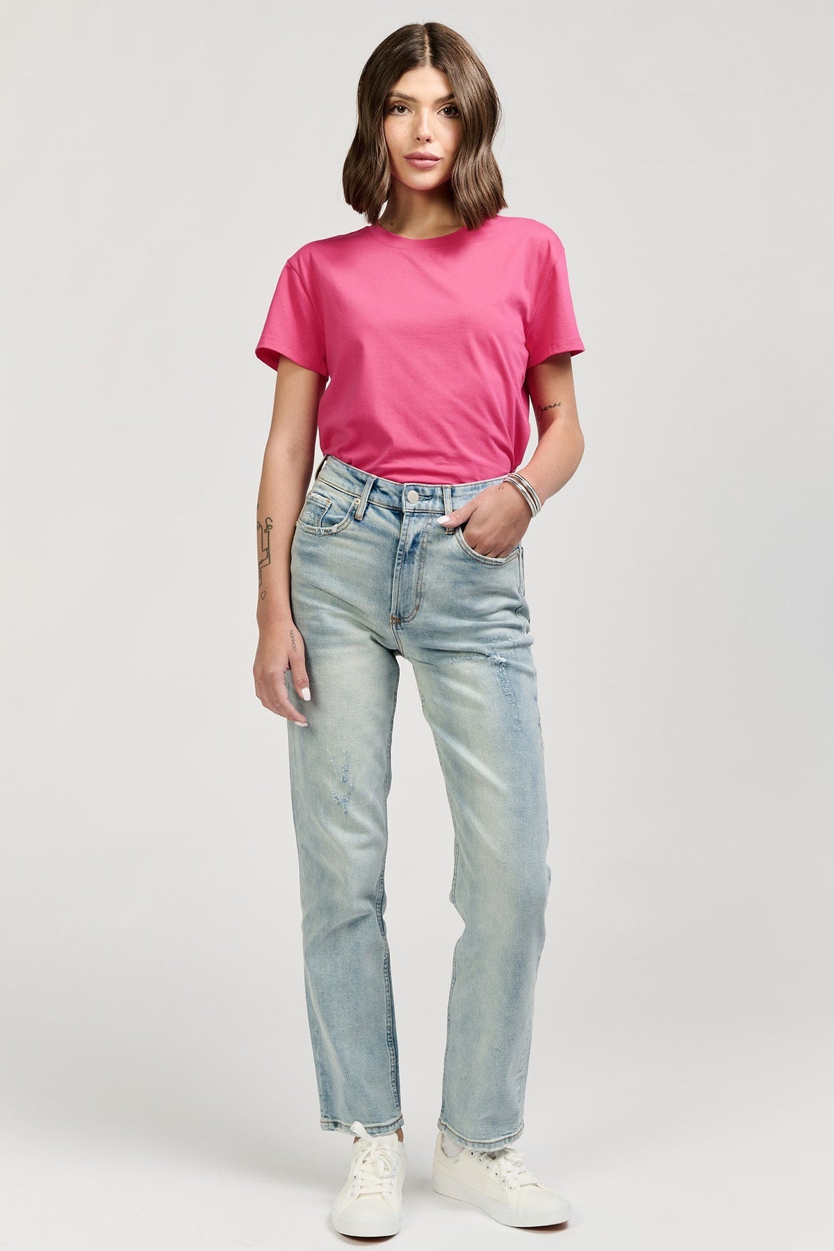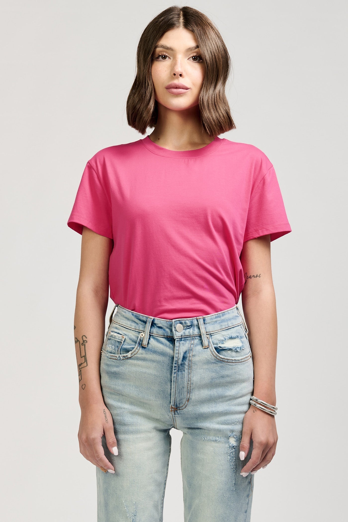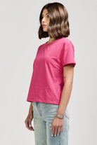 Delight in the Shyama tee in stretch jersey, a chic crew neck t-shirt expertly crafted from a premium blend of 95% cotton and 5% spandex for a breathable fit and exceptional comfort. This versatile piece in relaxed fitting features a contemporary design that seamlessly transitions from casual outings to relaxed evenings, embodying fashion with an effortless edge.