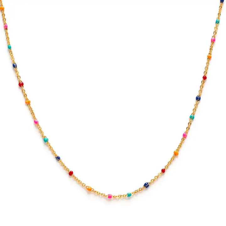 This cheerful multi colored enamel chain is a great summer layering piece. Made of 14k gold plated brass + coated to resist tarnish.