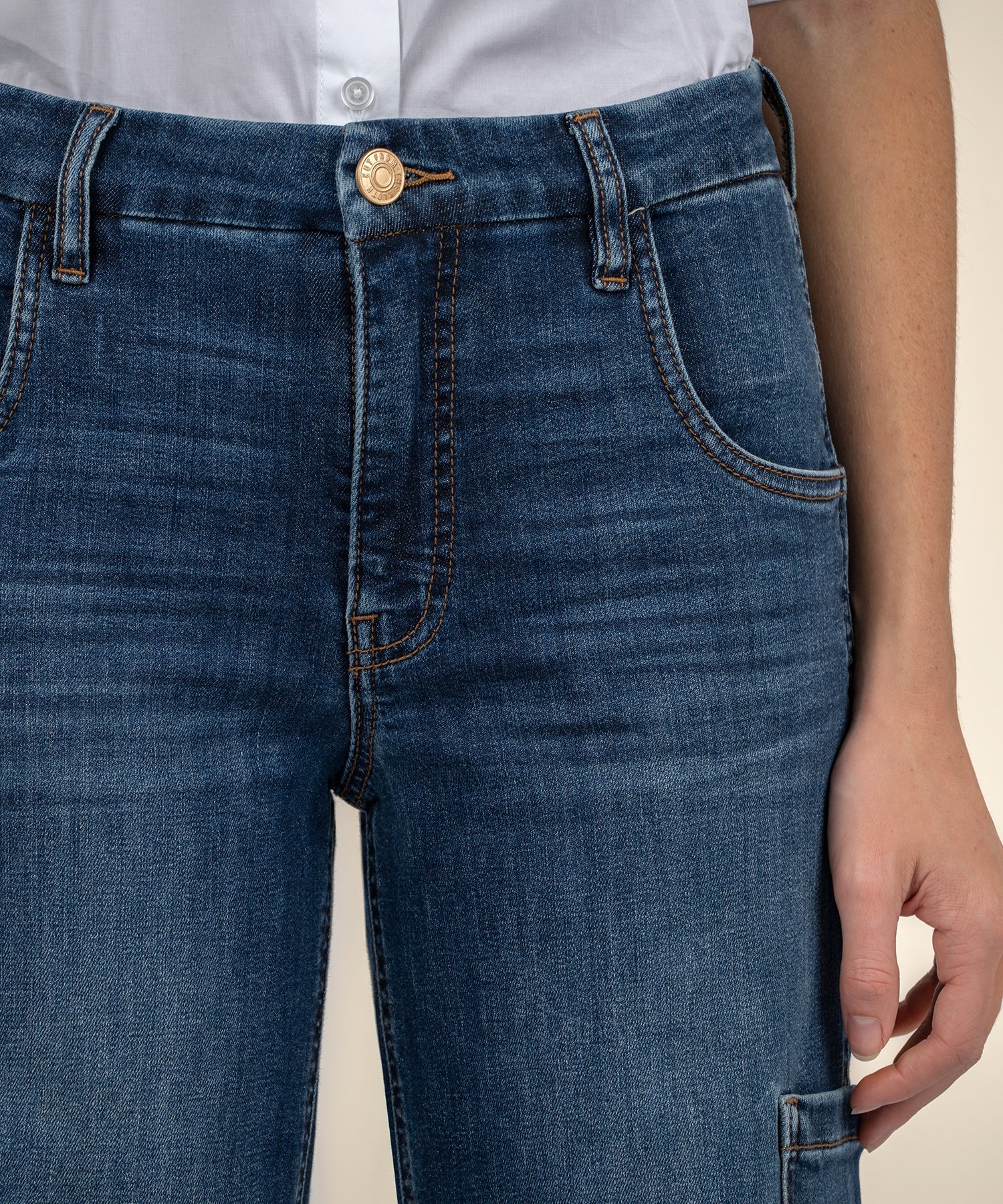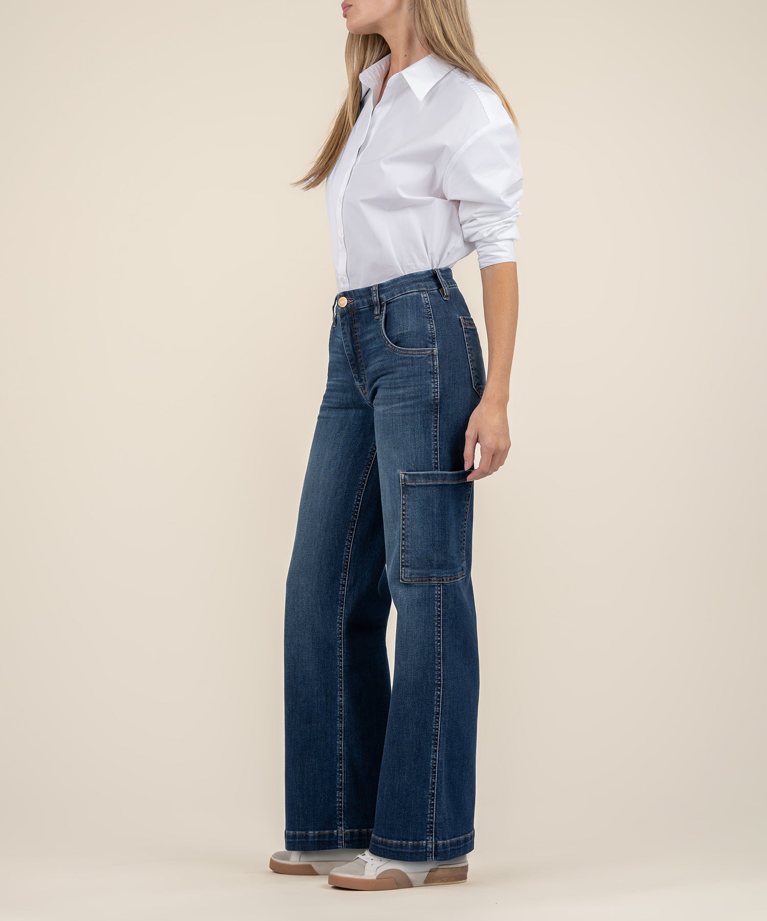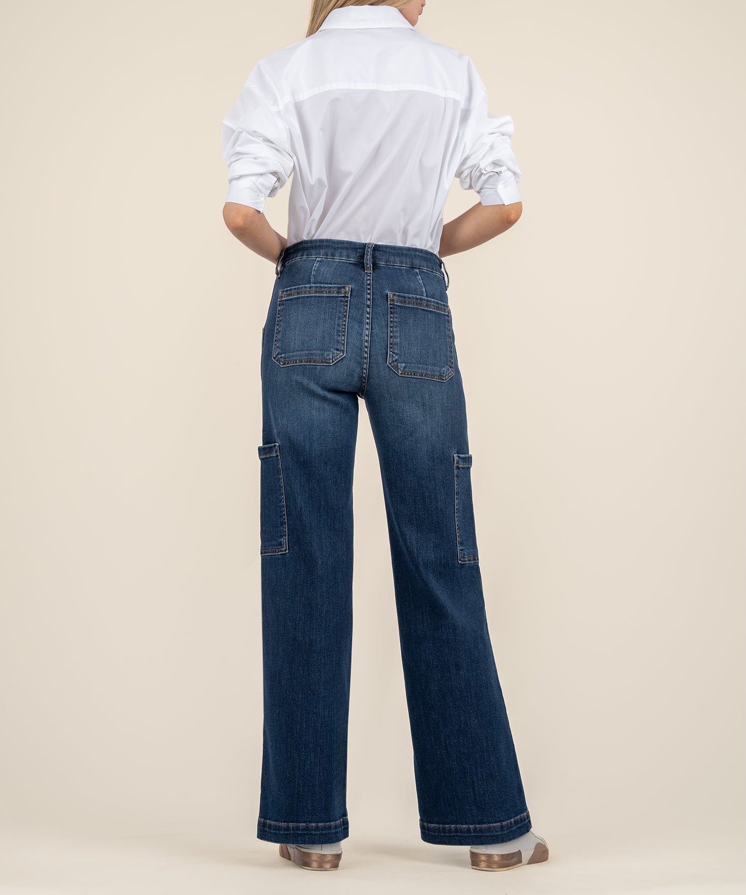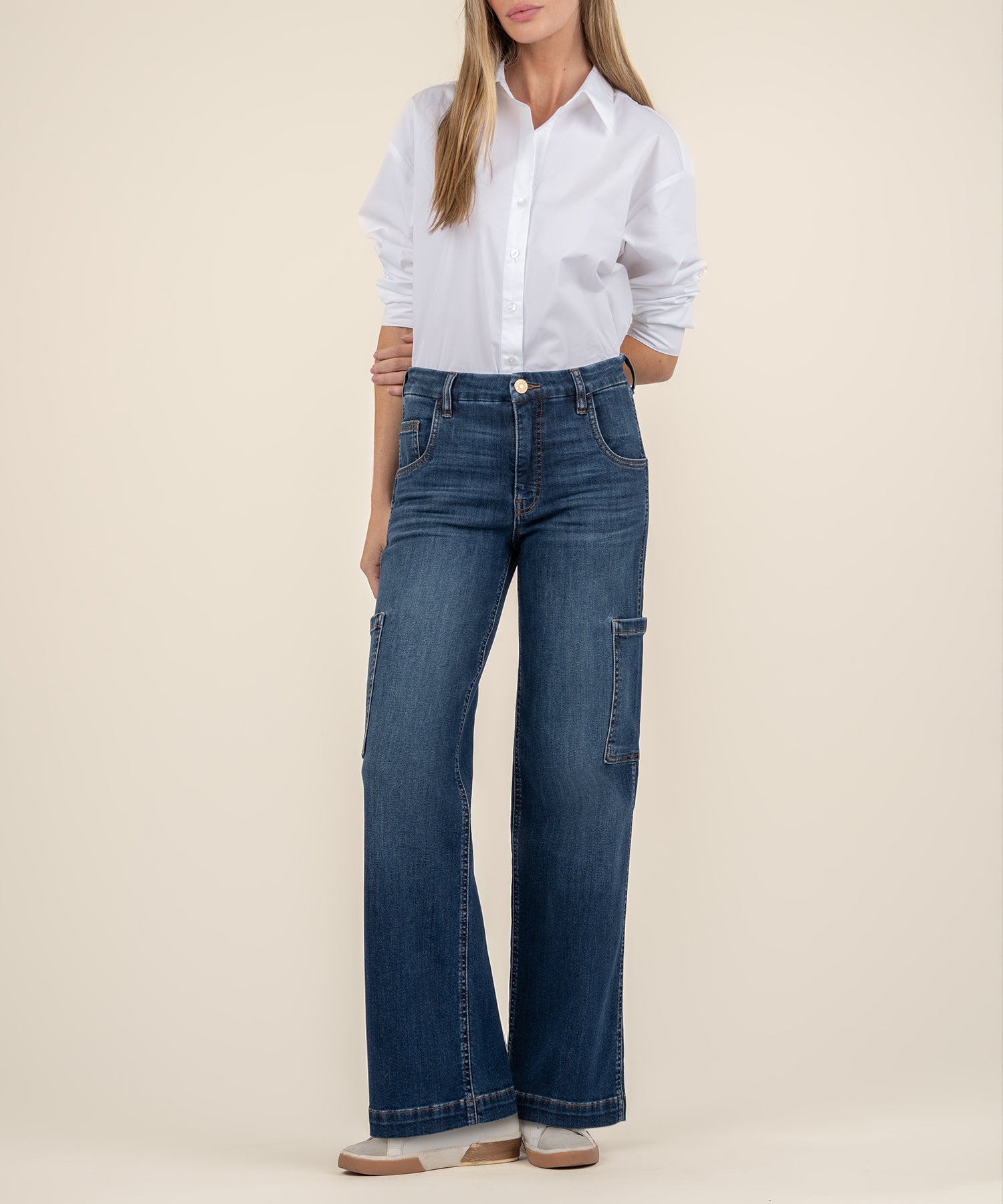 Rock a retro look in high-rise cargo jeans made with full-length wide legs and Fab Ab front pockets that shape and smooth in stretch denim.