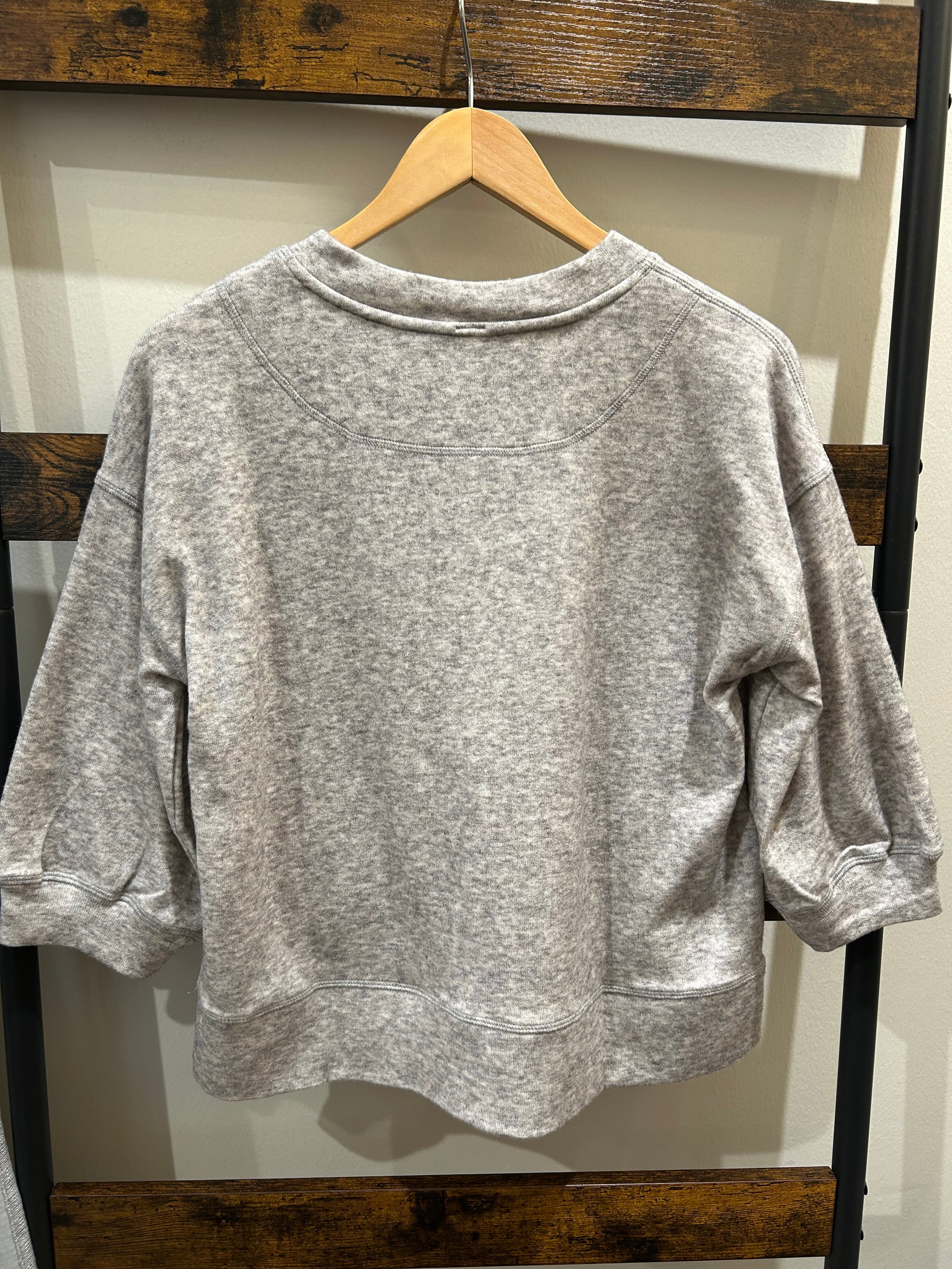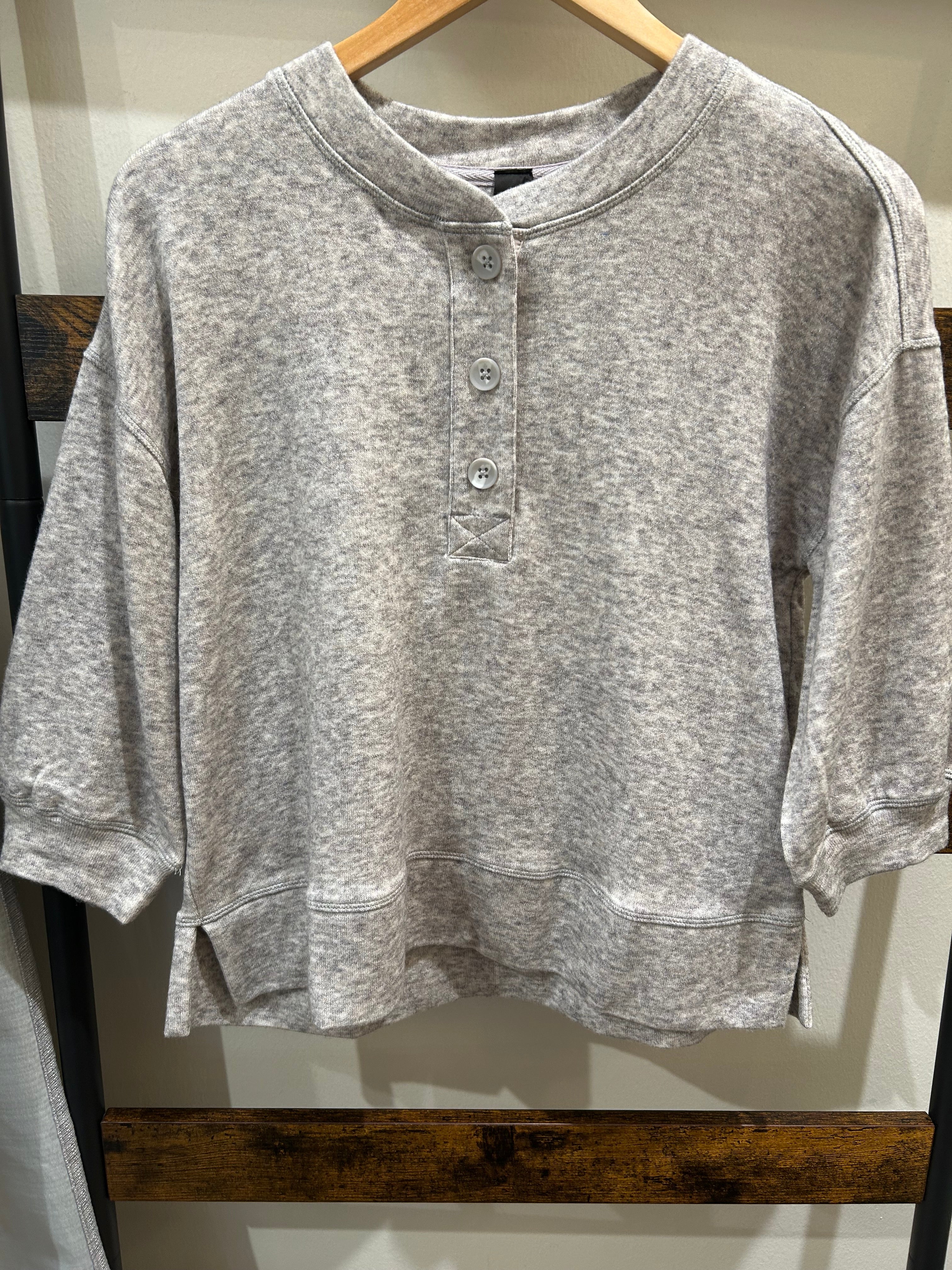 Elevate your everyday look with this playful Puff Sleeve Boxy Henley in heather grey. Featuring 3/4, charming puff sleeves and a relaxed boxy fit, it adds a fun twist to a classic style.