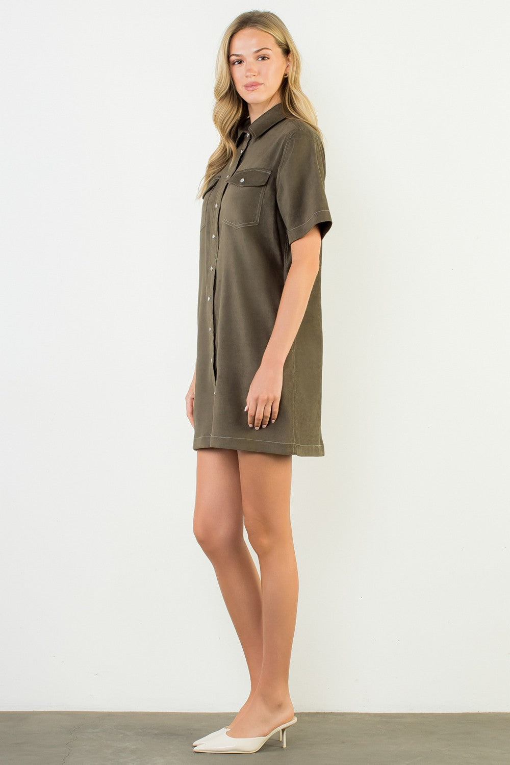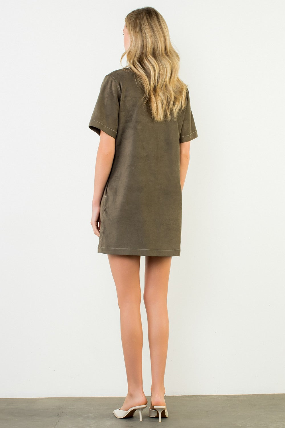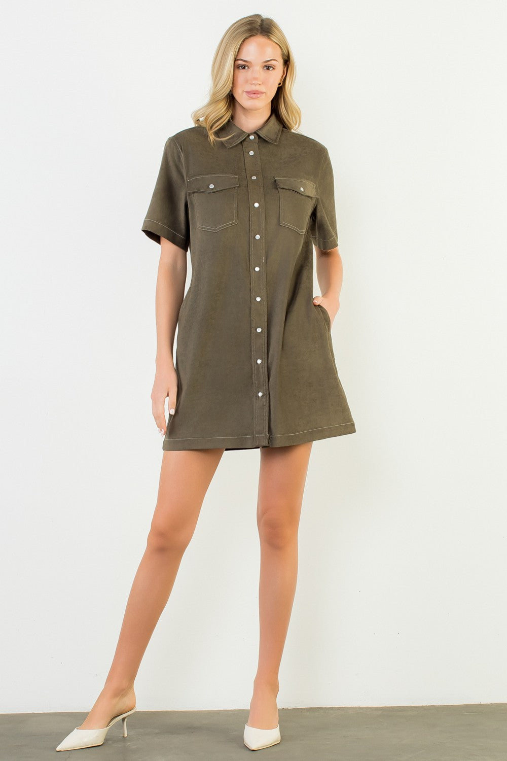 Step into effortless style with this olive suede dress featuring a playful button-front design. Its soft texture and flattering fit make it perfect for day-to-night adventures. Dress it up or down and enjoy the timeless charm with a fun twist.